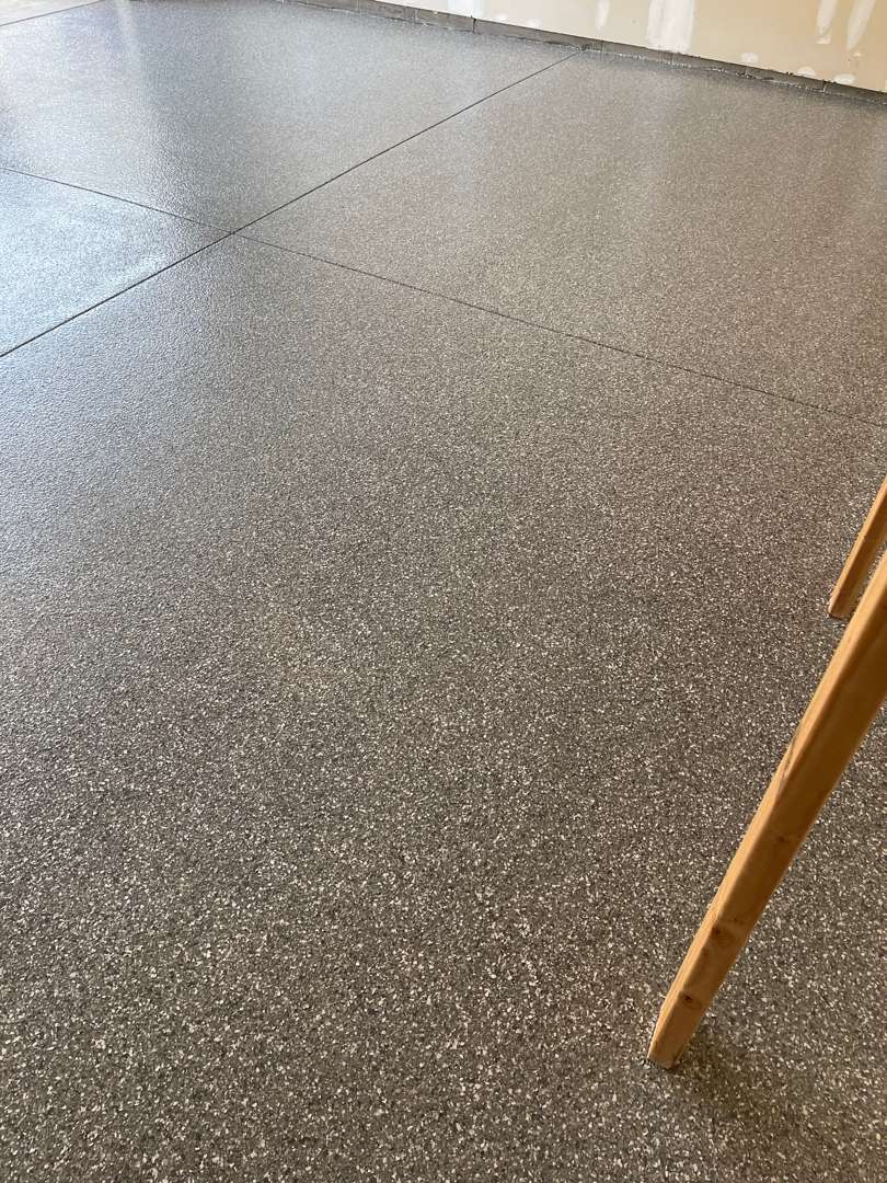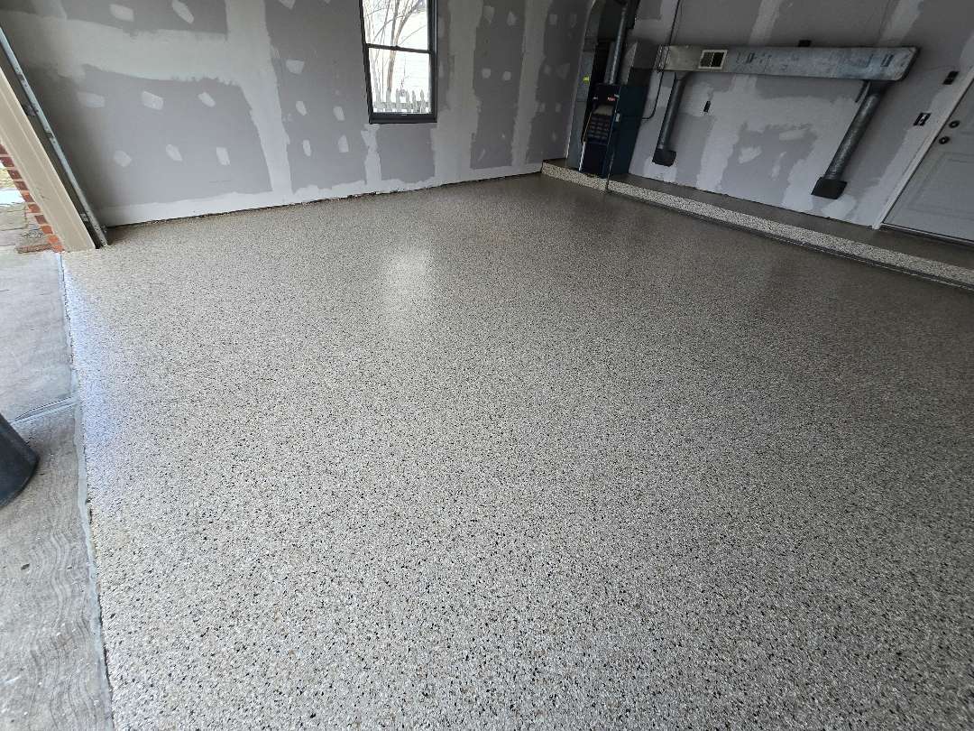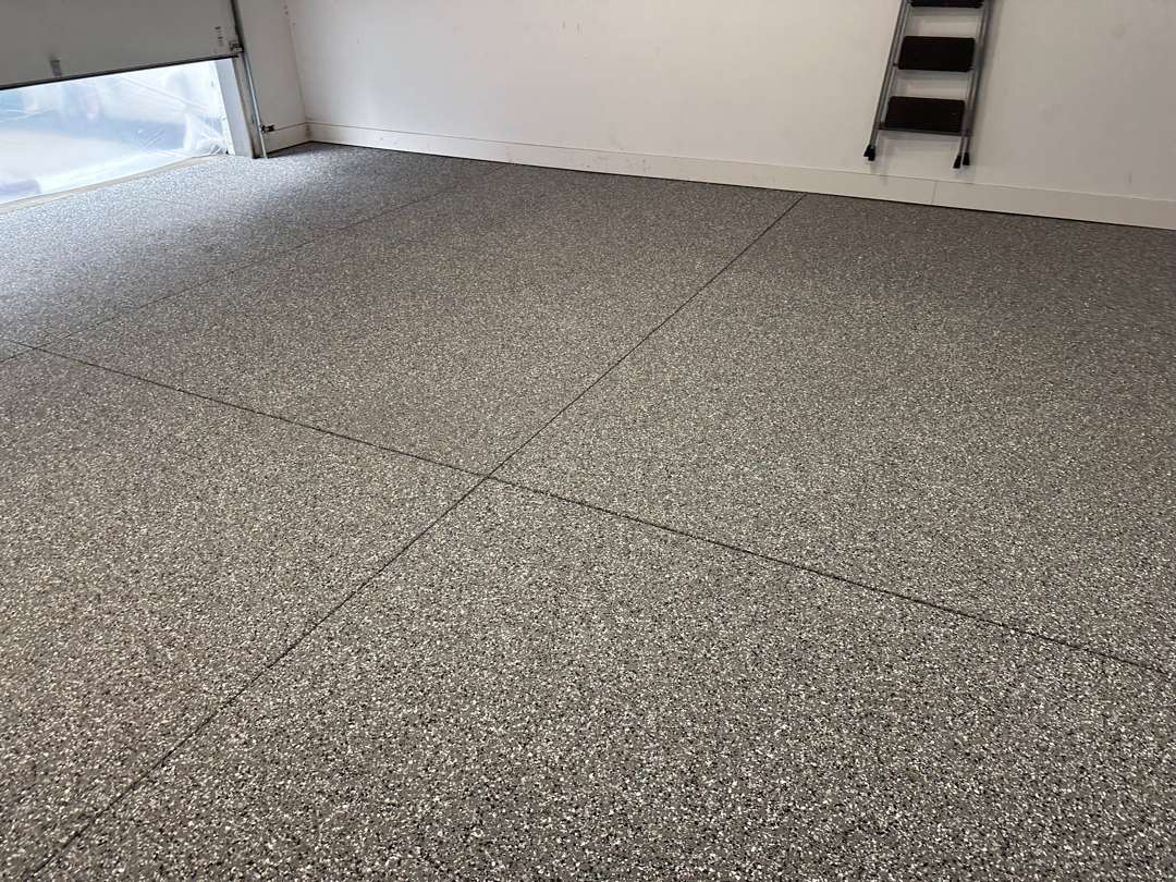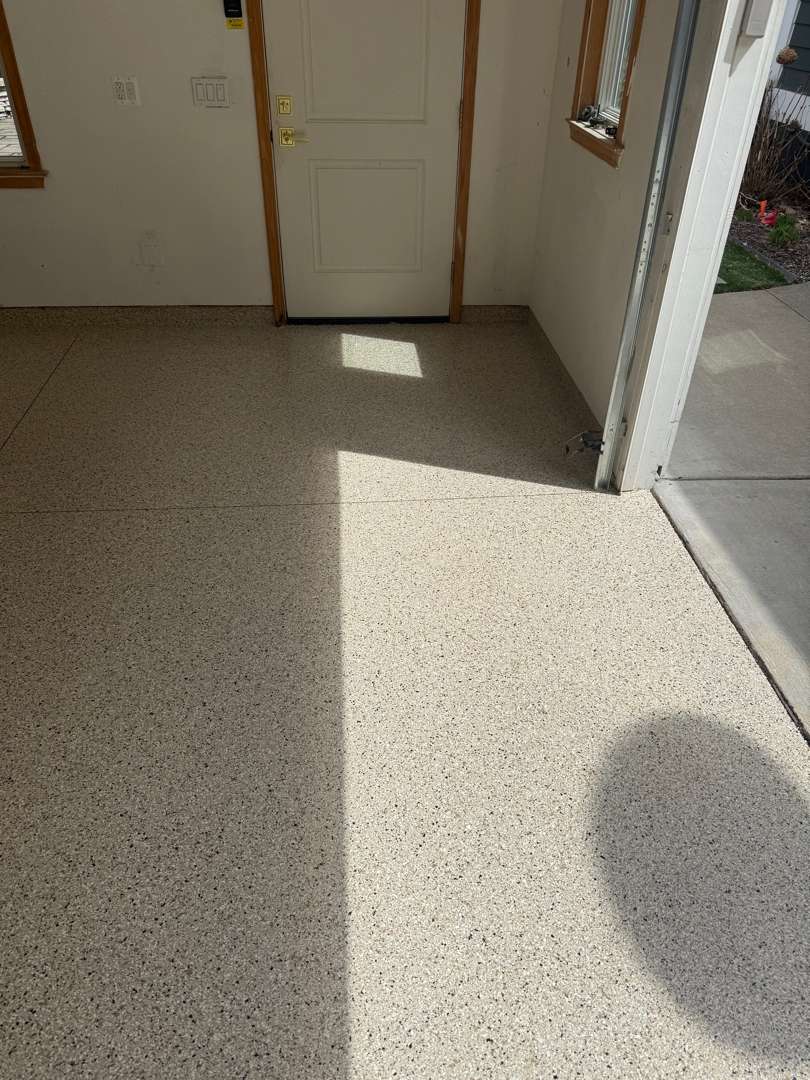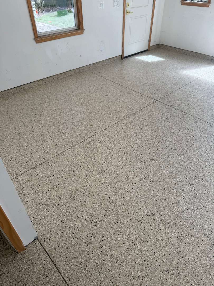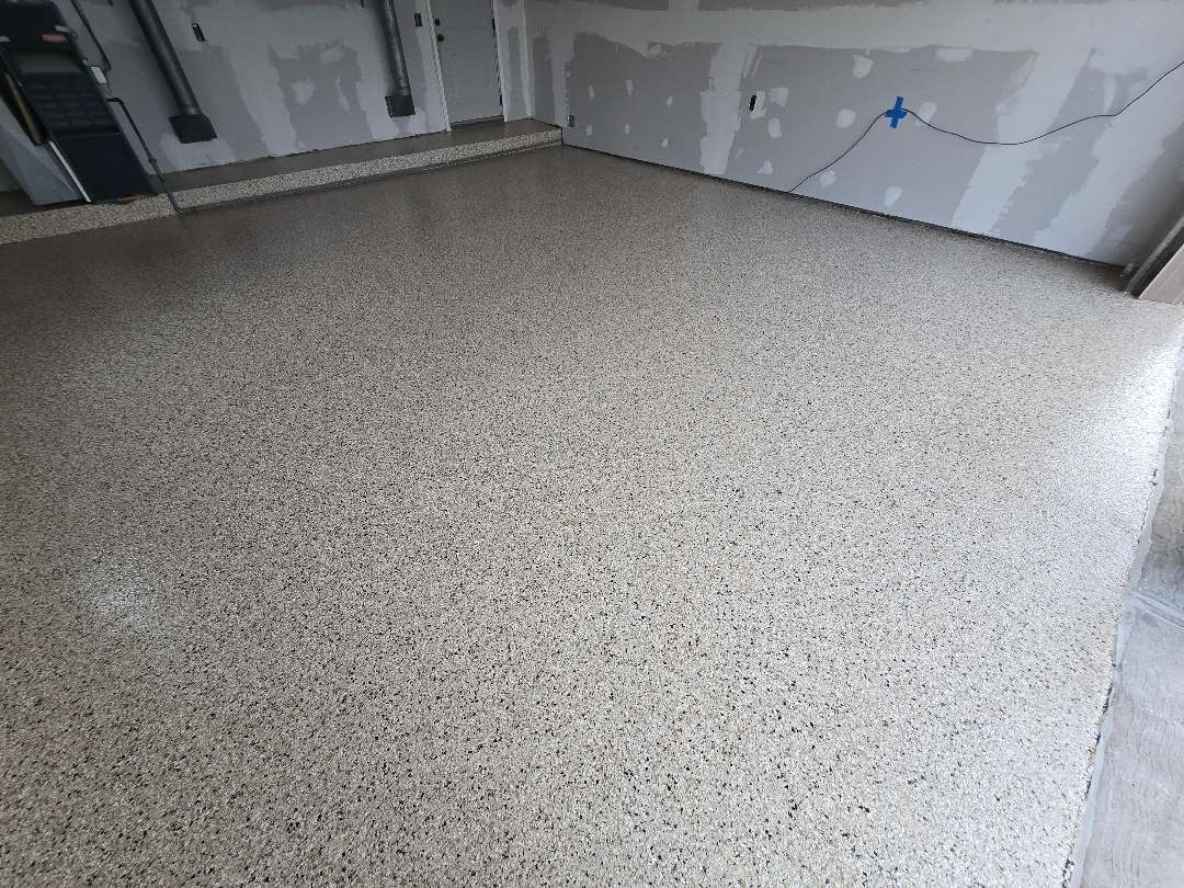 The homeowner selected Driftwood — a warm blend of tans, greys, and soft browns. It is a neutral color that works well against a range of wall finishes. Our crew applied the polyurea-polyaspartic coating system with 16-grit traction. Our team broadcast the decorative flake across the wet base coat. They then applied the heavy clear topcoat to lock in the flakes.