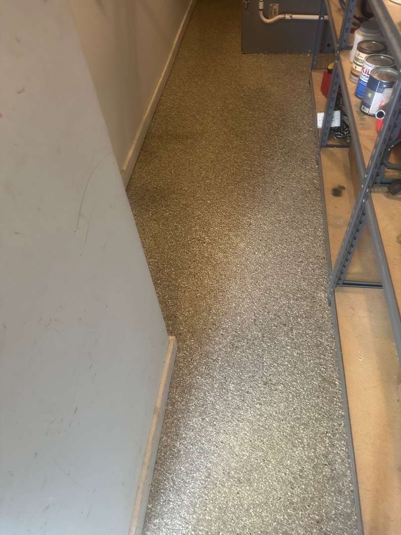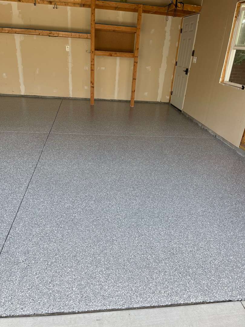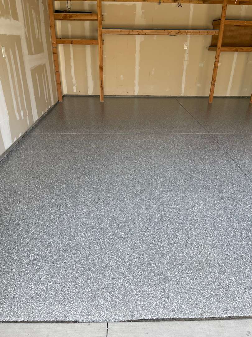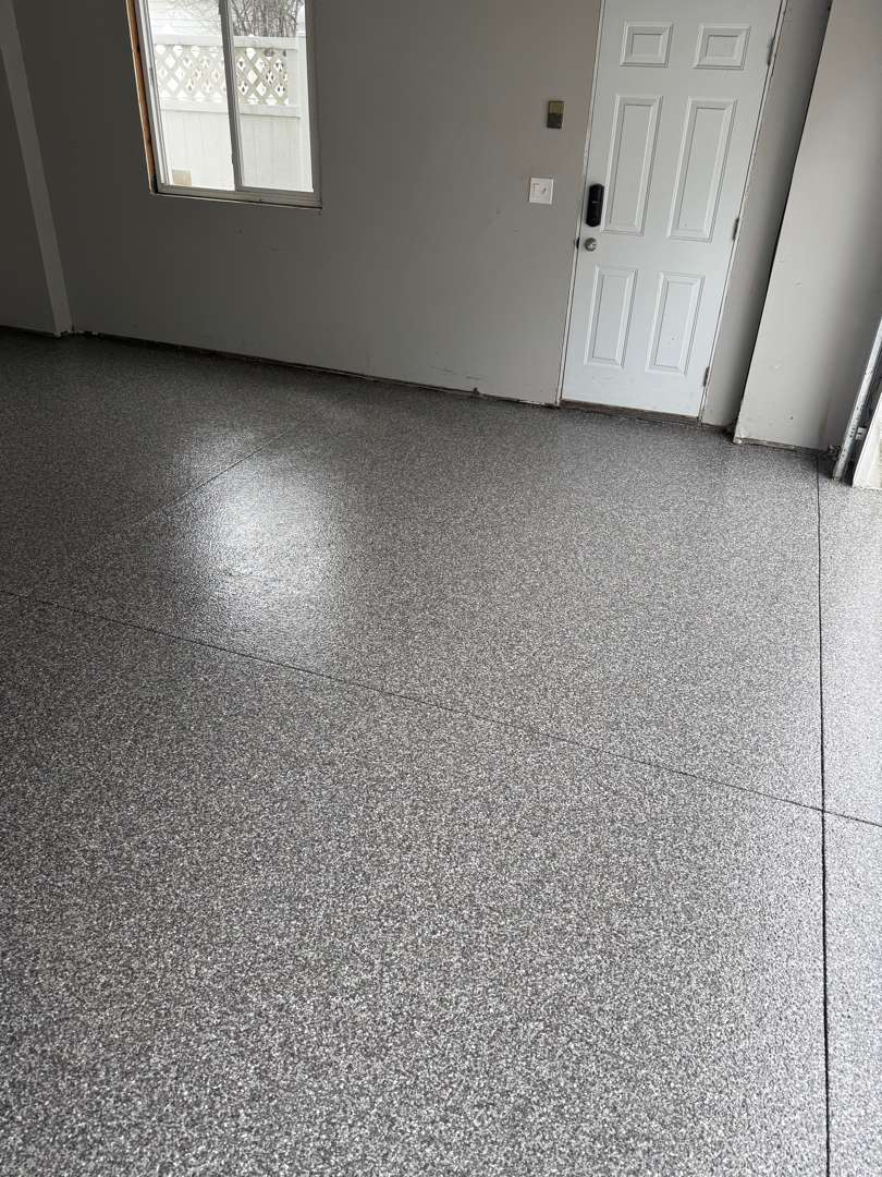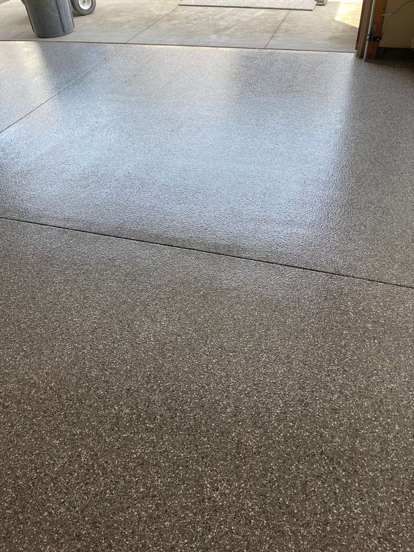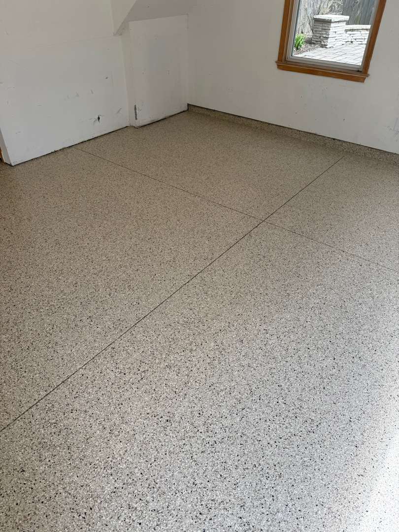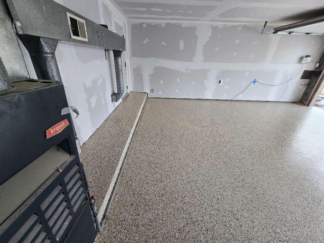 The homeowner selected Driftwood — a warm blend of tans, greys, and soft browns. It is a neutral color that works well against a range of wall finishes. Our crew applied the polyurea-polyaspartic coating system with 16-grit traction. Our team broadcast the decorative flake across the wet base coat. They then applied the heavy clear topcoat to lock in the flakes.