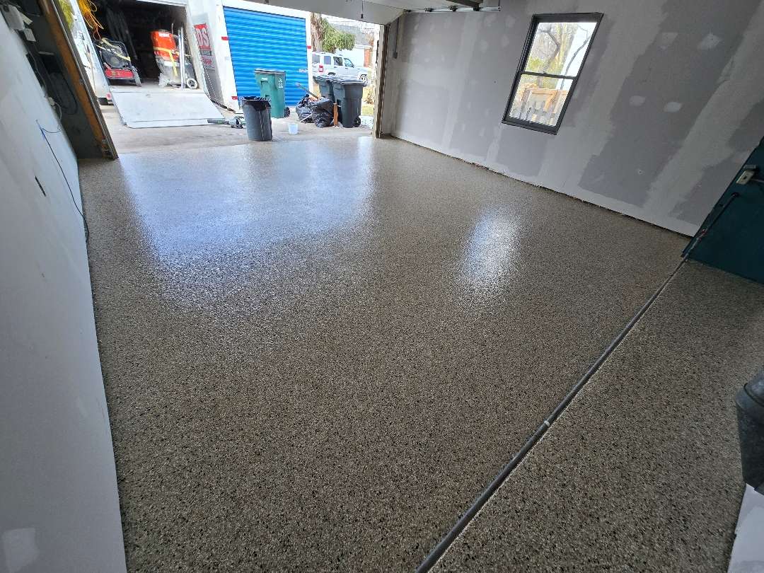 The finished floor on West Lincoln Street is a significant upgrade from what our crew found on arrival. Pebble Beach flake now covers what was a stained, cracked, and worn concrete surface. The warm, natural tone gives the working garage a cleaner, more finished character. The 36-grit traction provides reliable grip across the full floor. The floor is sealed, protected, and ready for years of use.