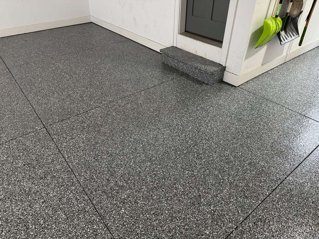 The homeowner selected Pebble Beach — a warm sandy blend of tans, greys, and creams with natural-looking flecks throughout. Our crew applied the MC-3.5 polyurea-polyaspartic coating system with 36-grit traction. Our team broadcast the decorative flake across the wet base coat. They then applied the heavy clear topcoat to lock in the flakes and seal the surface. There were no steps on this installation.