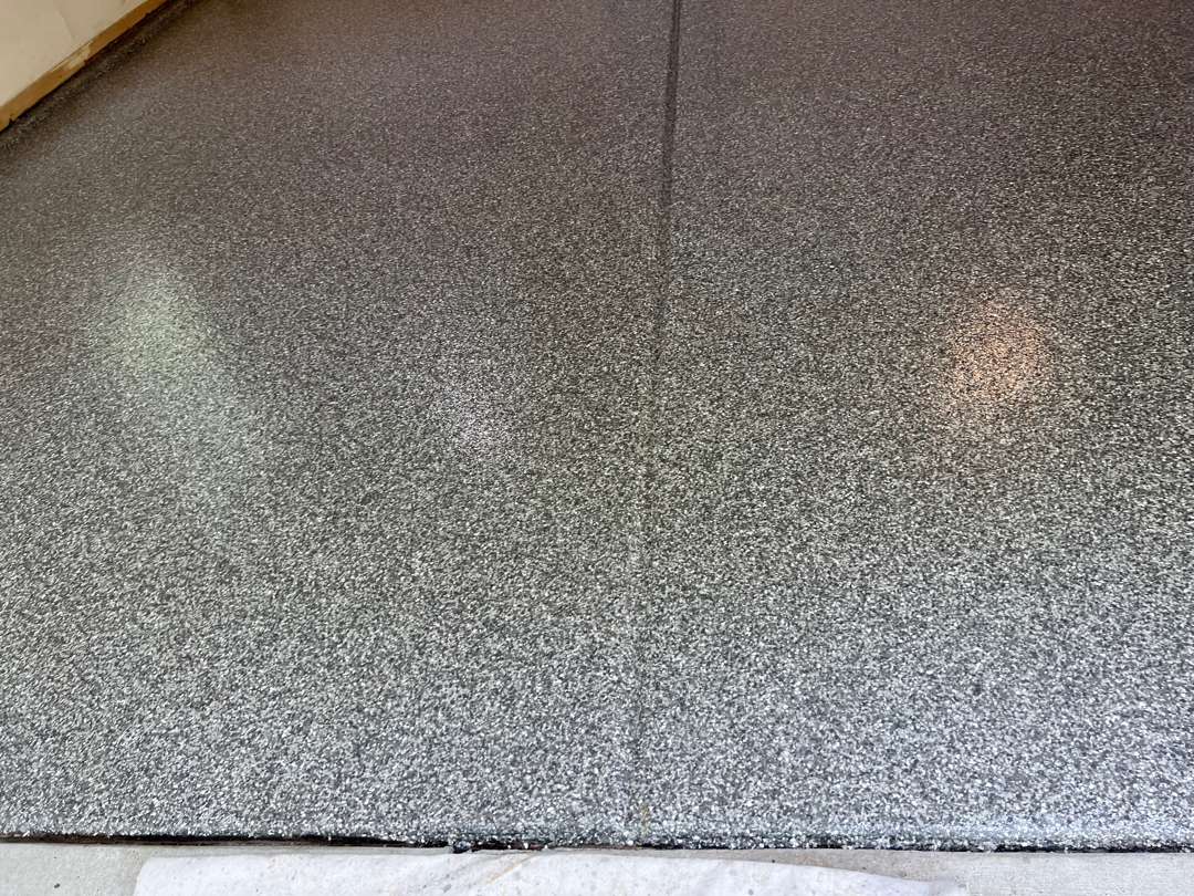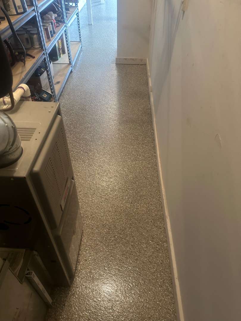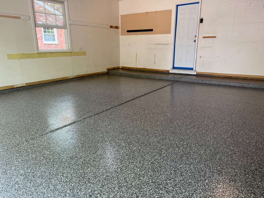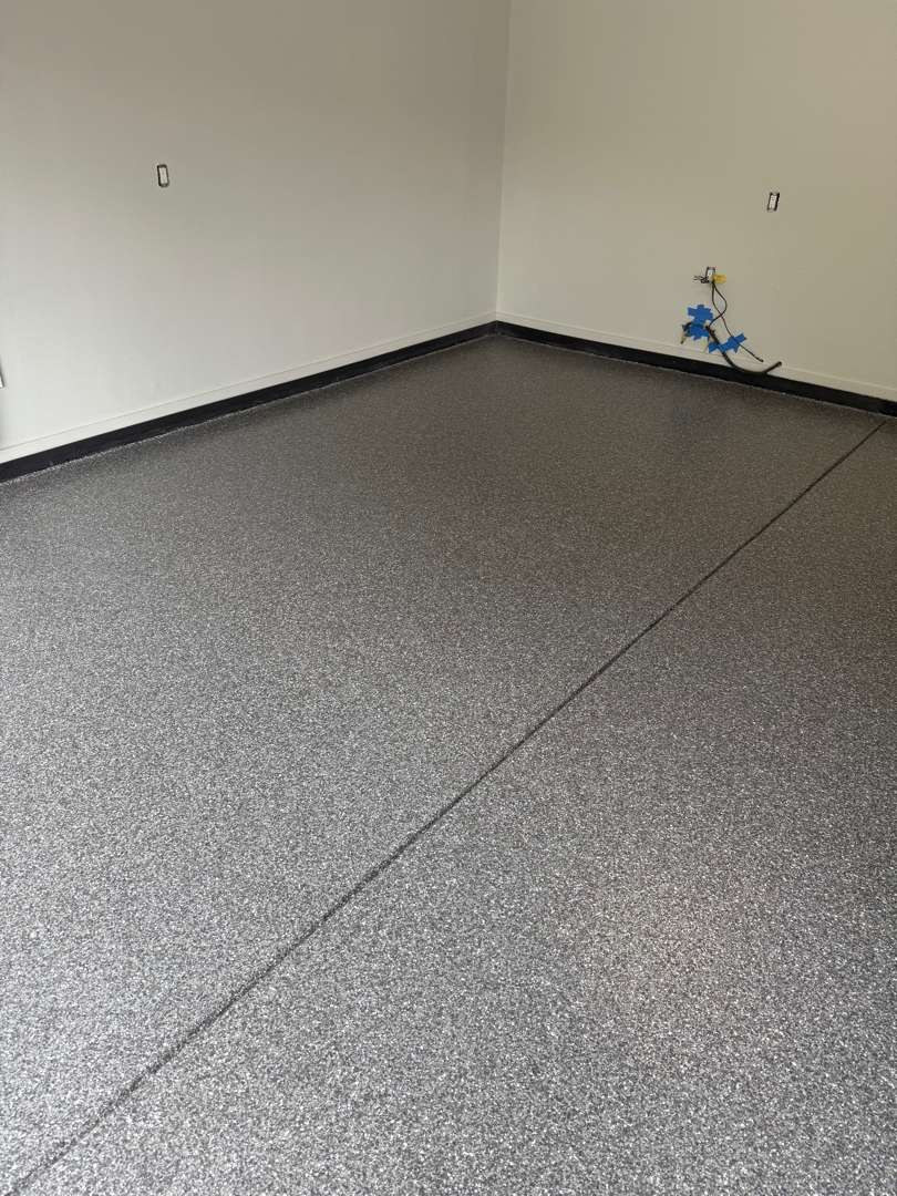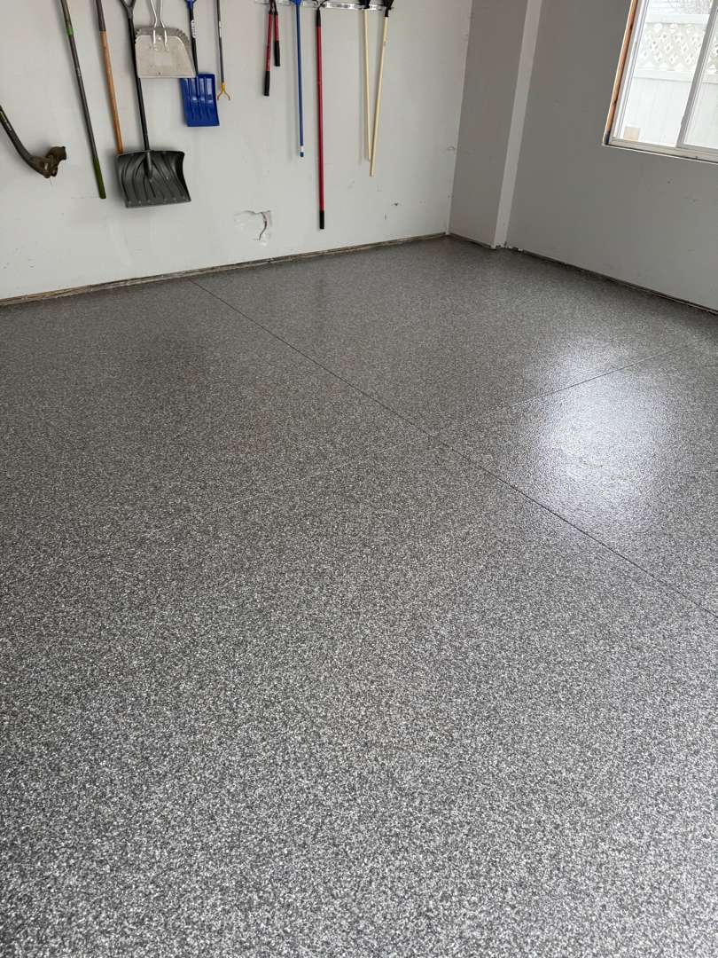 The 740-square-foot floor on Shipman Boulevard is a clean, striking transformation. Smoke gives the space a bold, dark character. It contrasts sharply with the white walls and trim. The topcoat adds depth and sheen to the flake beneath it. The floor is sealed, protected, and ready for years of use.