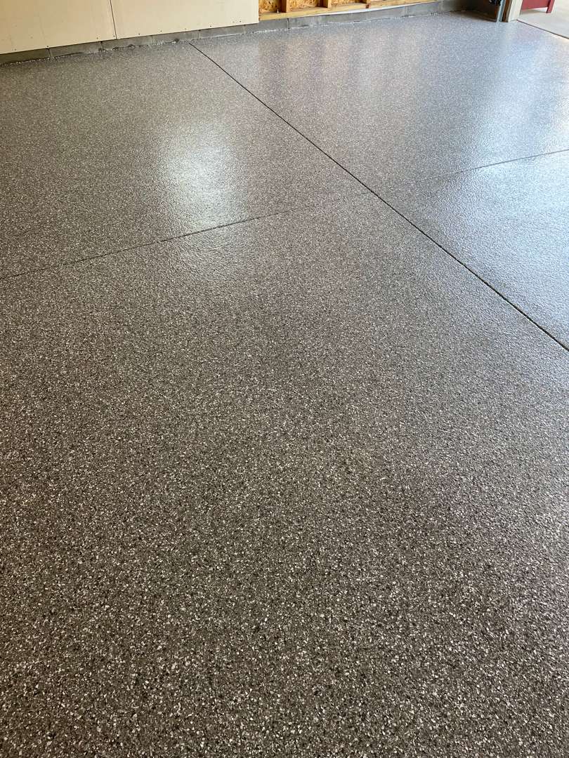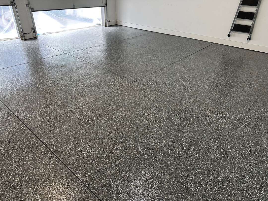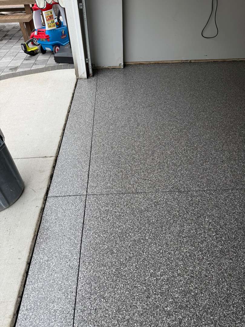 The homeowner selected Silvercreek — a cool charcoal blend with dark and light grey flecks throughout. Our crew applied the MC-3.2 polyurea-polyaspartic coating system with 36-grit traction. Our team broadcast the decorative flake across the wet base coat. They then applied the heavy clear topcoat to lock in the flakes and seal the surface. There were no vertical surfaces and no steps on this installation.