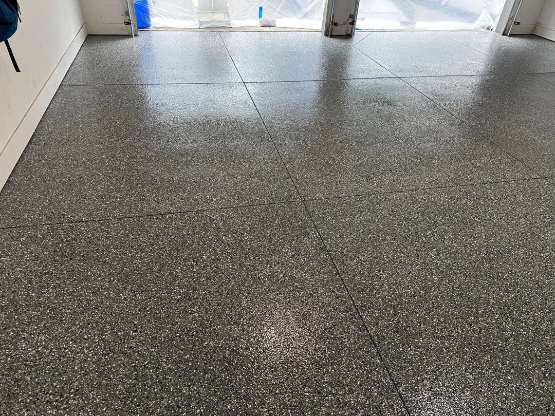 Our crew applied the MC3.2 polyurea-polyaspartic coating system with 24-grit traction. The color selected was Smoke — a deep charcoal blend with dark and light flecks. Our team broadcast the decorative flake across the wet base coat. They then applied the heavy clear topcoat to seal the surface.