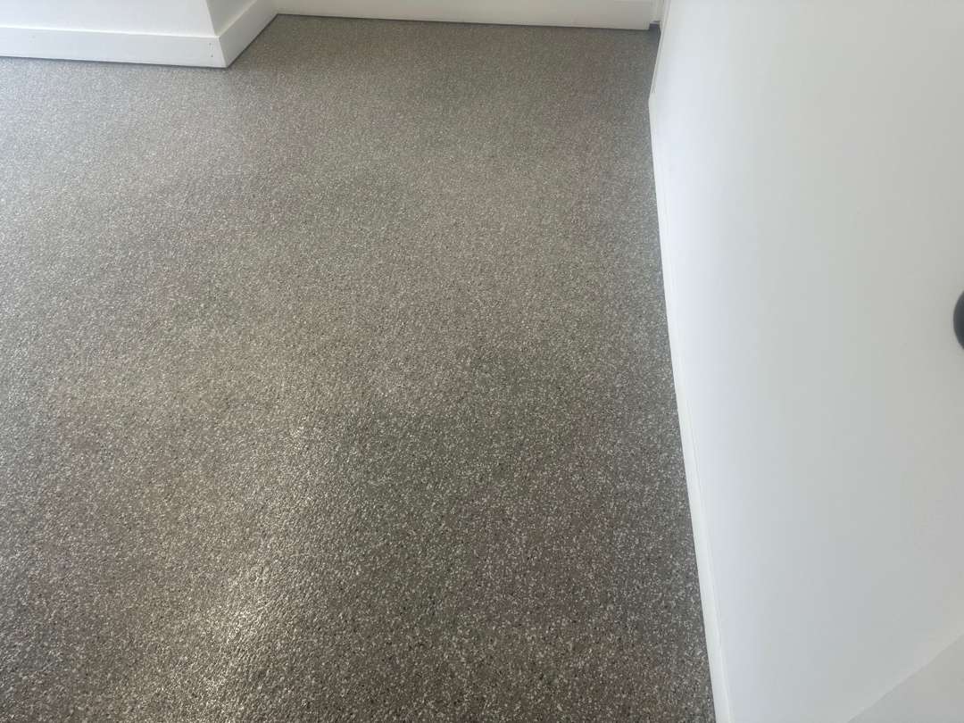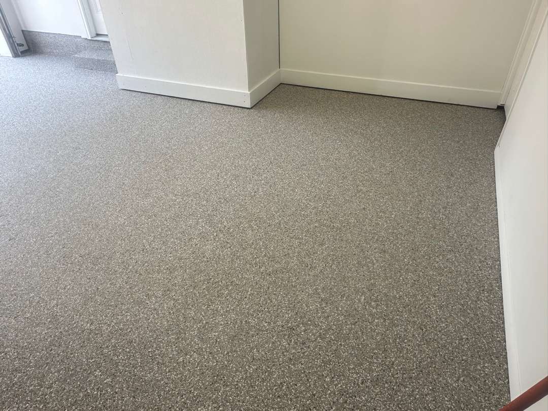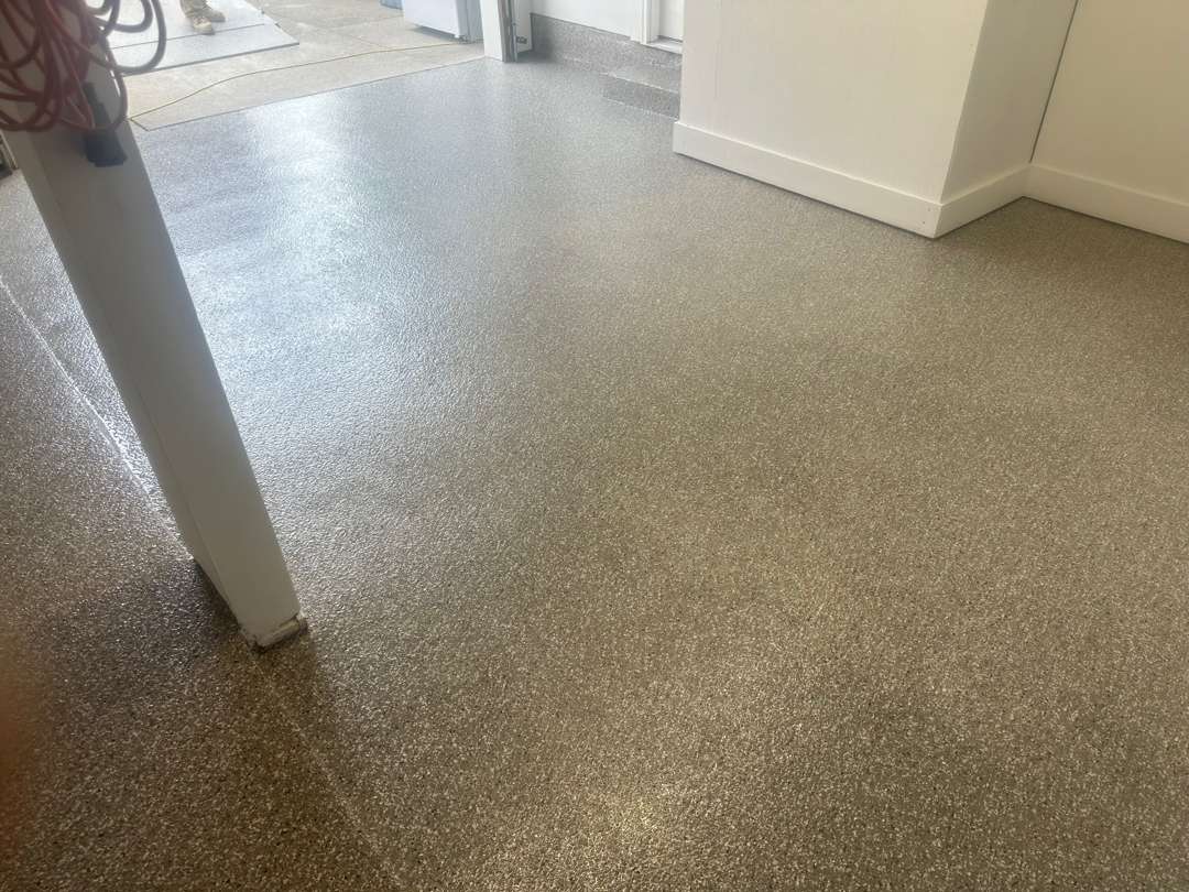 The 18 linear feet of vertical surfaces were coated as part of the installation. Our crew brought the Pebble Beach system up and over the curb face along the back wall and along the perimeter verticals. The coating integrates cleanly from the floor up the vertical face, presenting a continuous, finished surface throughout the space.