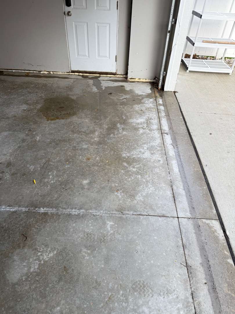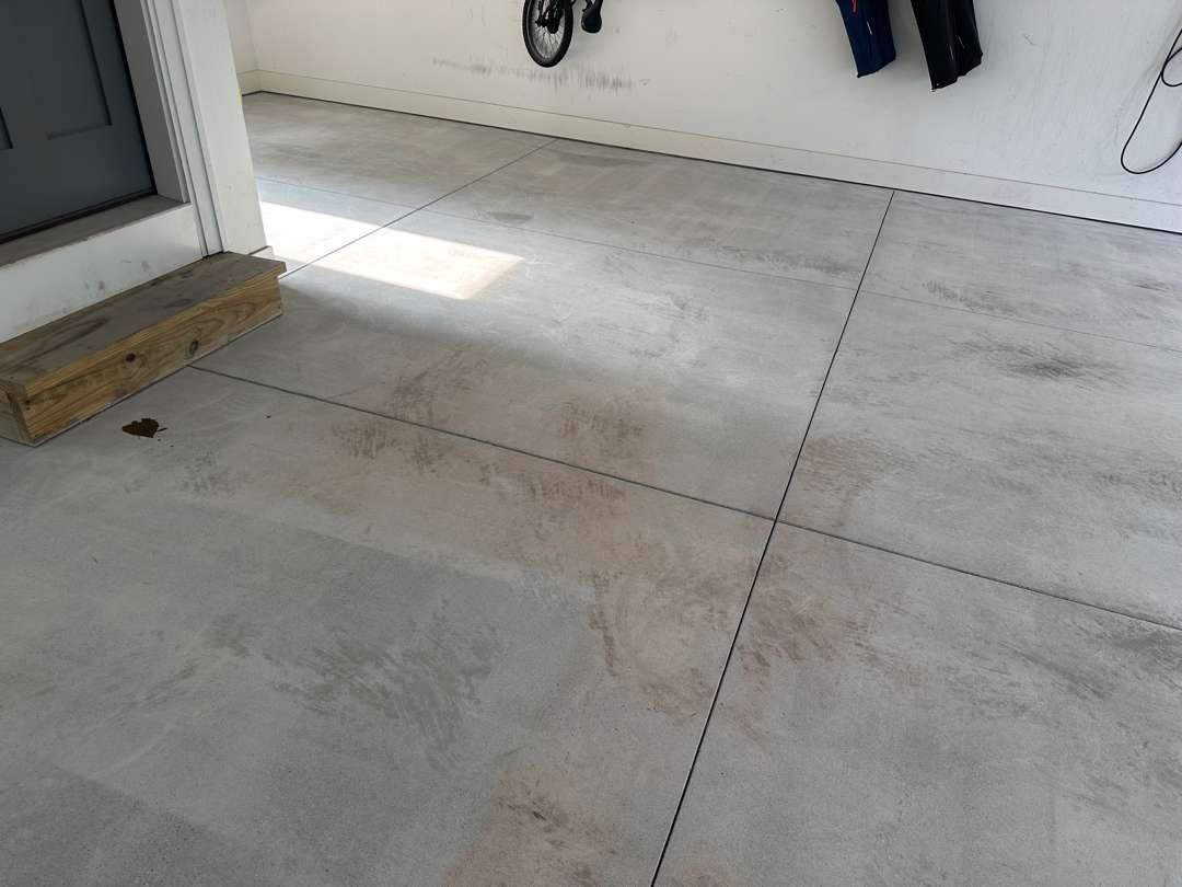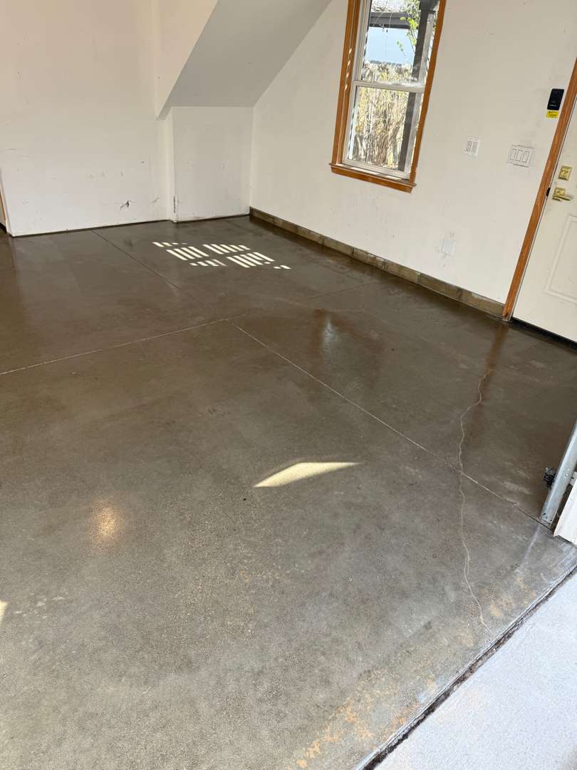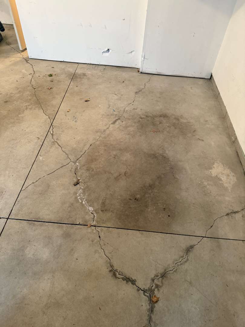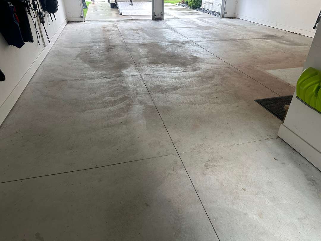 Winter road salt, freeze-thaw cycles, automotive fluids, and daily vehicle traffic degrade unprotected garage concrete over time. The damage typically appears as oil staining, cracking, surface pitting, and adhesion failure in previously coated floors.