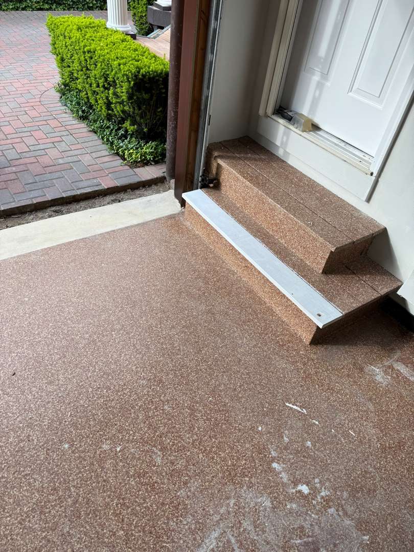 The before-and-after on Purdy Street tells the complete story. What started as a chalky, failing reddish-brown coating over cracked and deteriorating concrete became a clean Silvercreek installation — dark charcoal flake running wall to wall, steps integrated seamlessly, front lip rebuilt and properly protected. The 36-grit traction provides confident grip underfoot. The sealed surface now handles vehicle traffic, foot traffic, and Michigan’s freeze-thaw cycles without complaint.