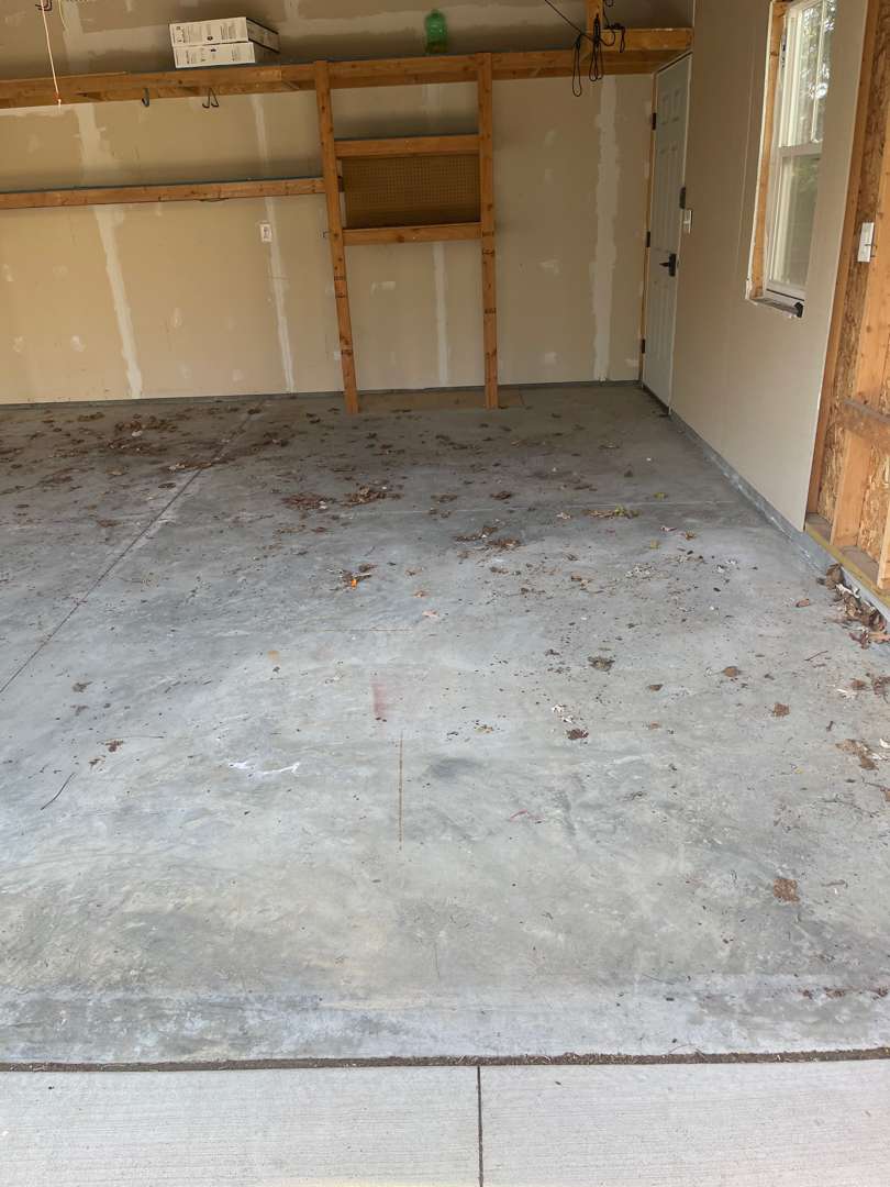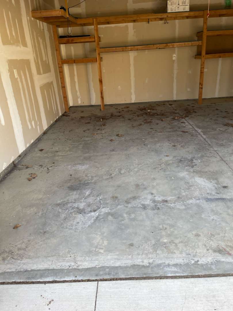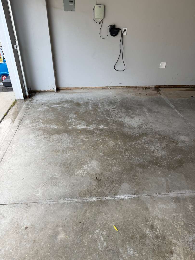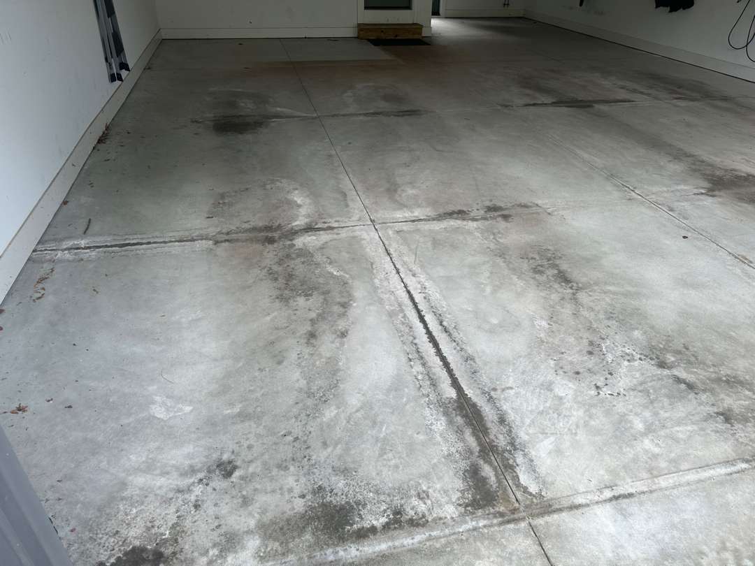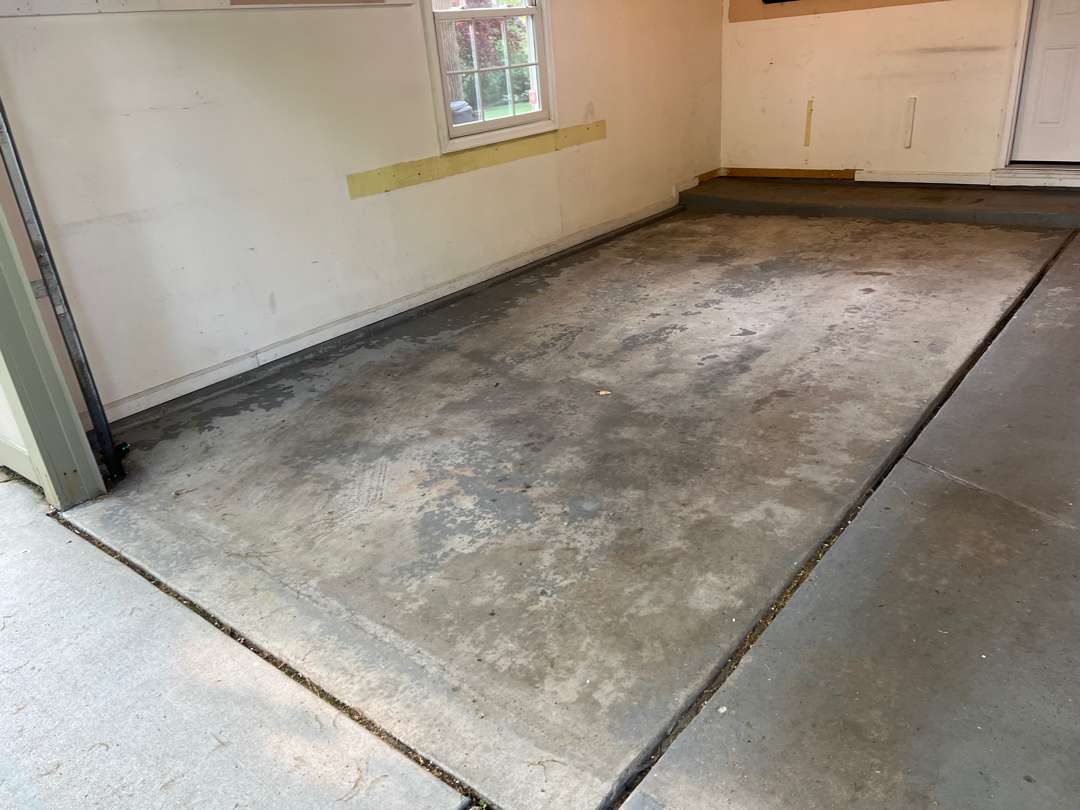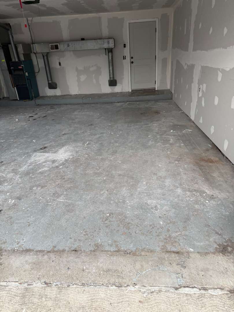 Our crew arrived at this Wakefield Street property during an active renovation. The garage walls were still in the drywall mud and tape stage. The concrete floor showed the evidence of construction work throughout. Drywall mud had dripped and dried across the slab. Paint scuffs and debris covered the surface. Oil spots marked the center of the floor.