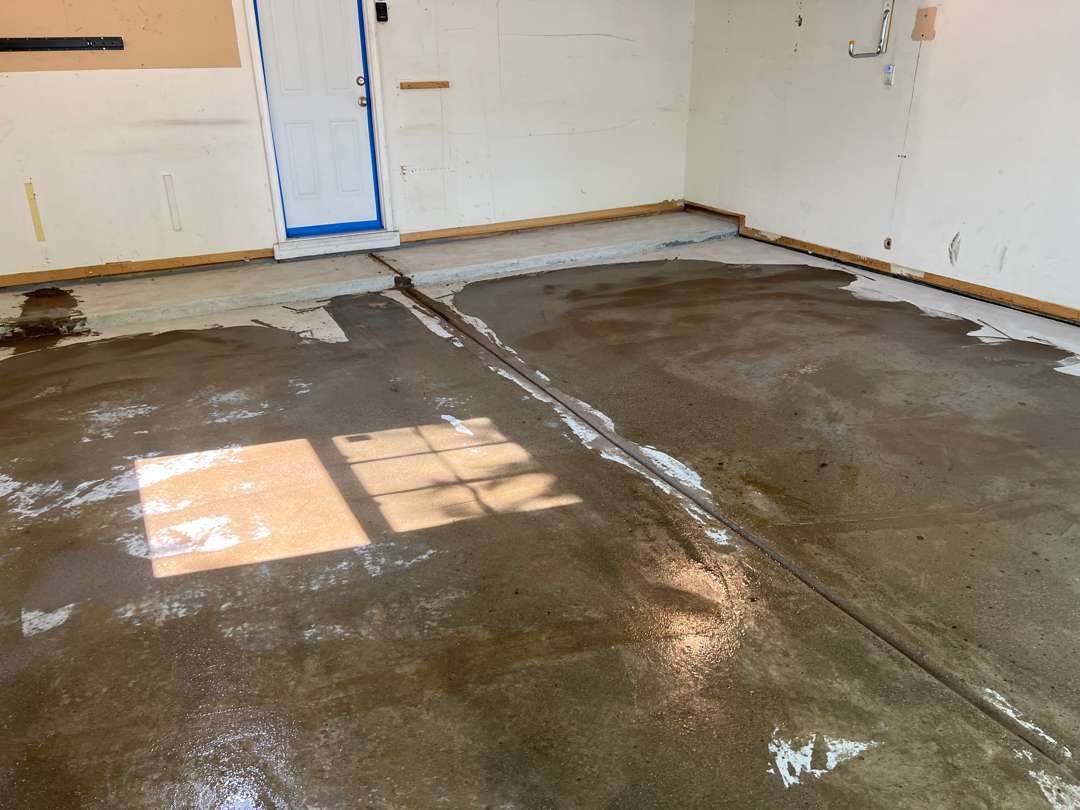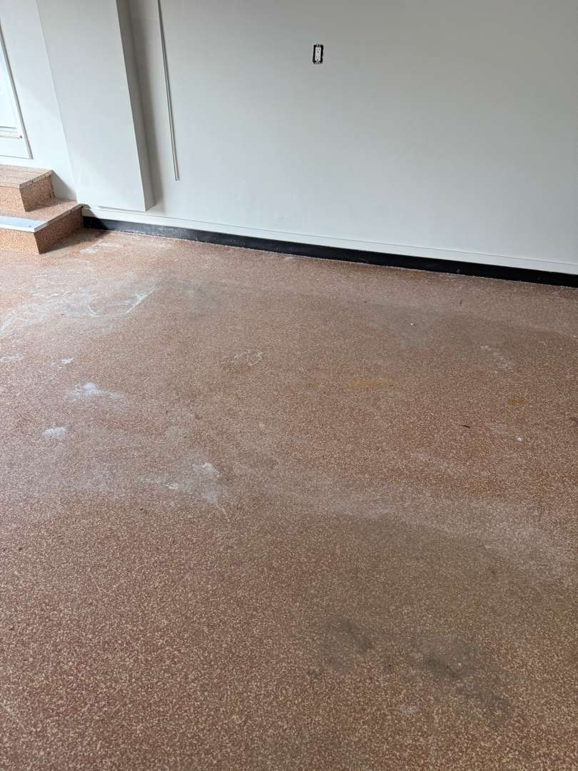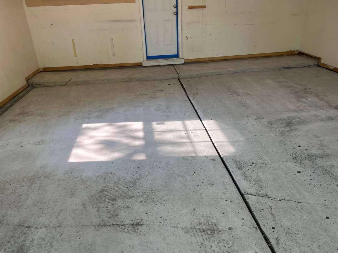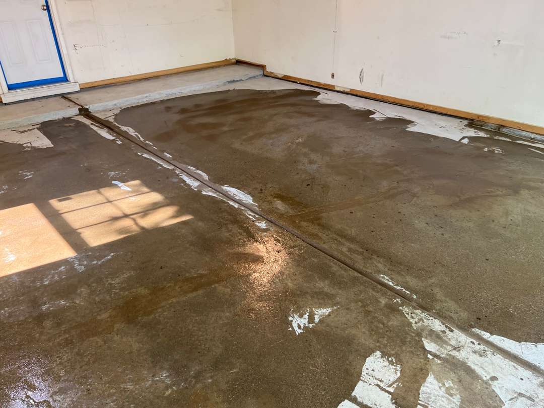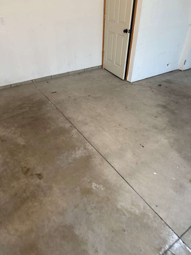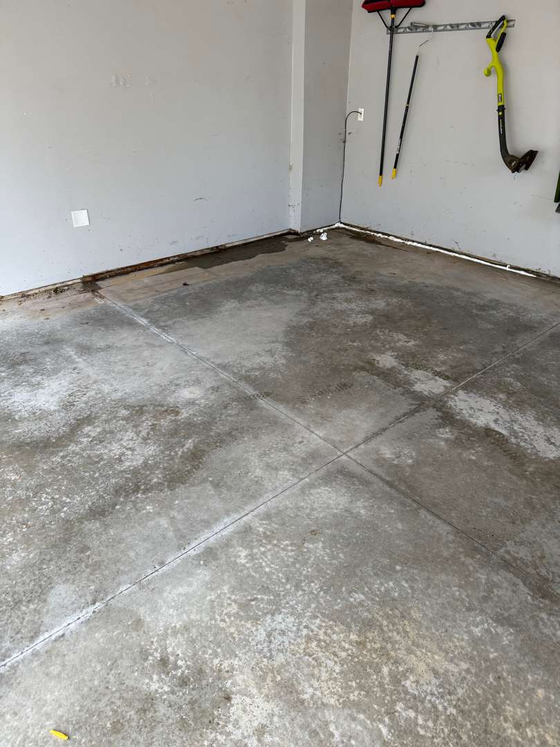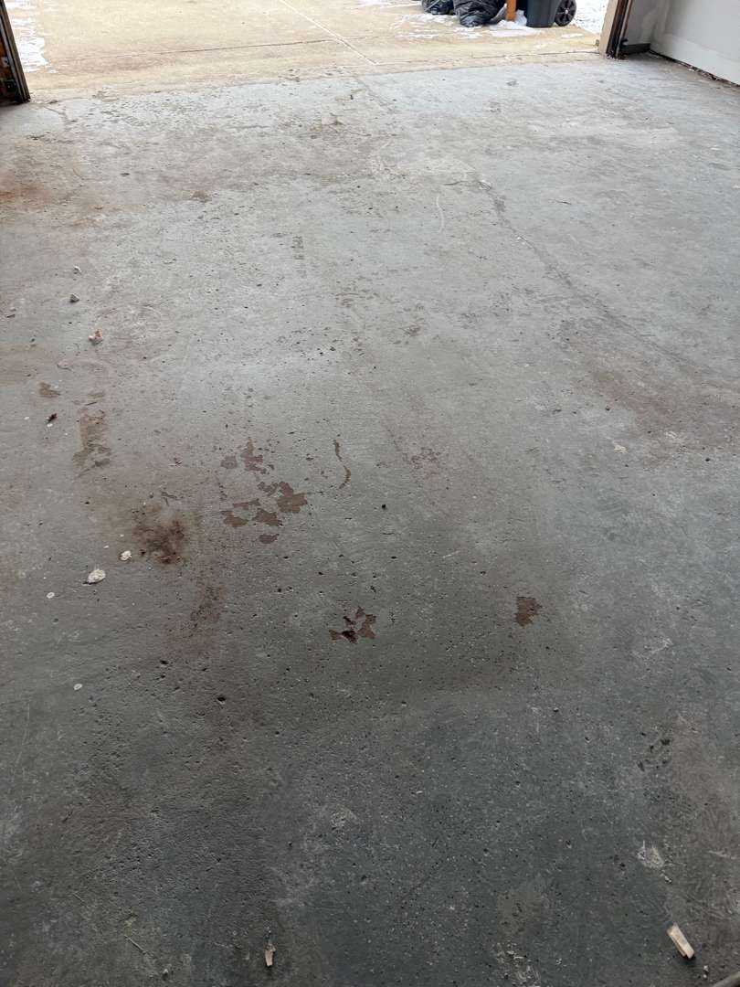 Our crew arrived at this Wakefield Street property during an active renovation. The garage walls were still in the drywall mud and tape stage. The concrete floor showed the evidence of construction work throughout. Drywall mud had dripped and dried across the slab. Paint scuffs and debris covered the surface. Oil spots marked the center of the floor.