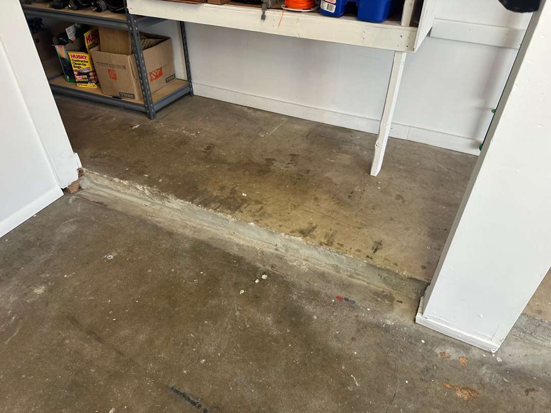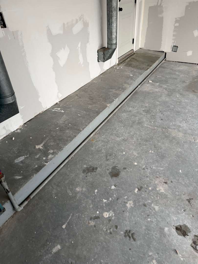 A raised concrete curb ran along the back wall of the garage. This kind of curb is common in new construction. It serves as a barrier between the garage floor and the wall framing. The curb showed cracking along the riser face. Our crew applied patch compound to the cracked sections before any coating work began.