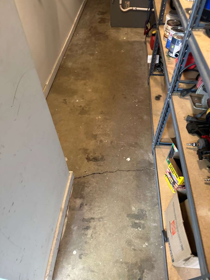Our crew applied mender compound directly into each crack across the slab. The repair photos show the brown compound tracing the full length of every split — along slab joints, across the center sections, and up toward the walls. Each void was filled, worked in, and leveled flush with the surrounding surface. The front lip received the same focused attention. Our crew rebuilt the damaged edge with mender compound, restoring it to a solid, coatable profile. A repaired lip holds. A skipped repair fails.