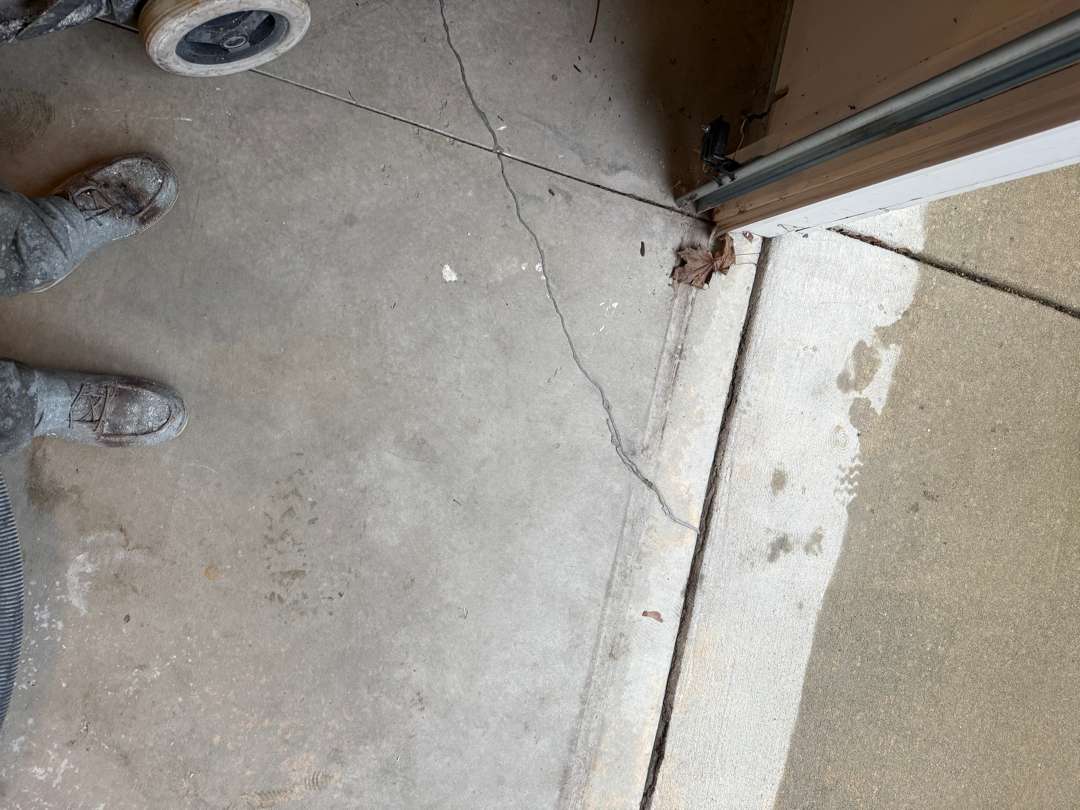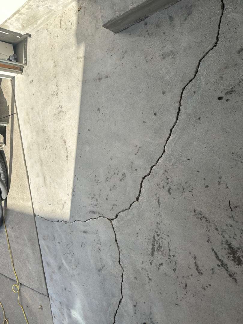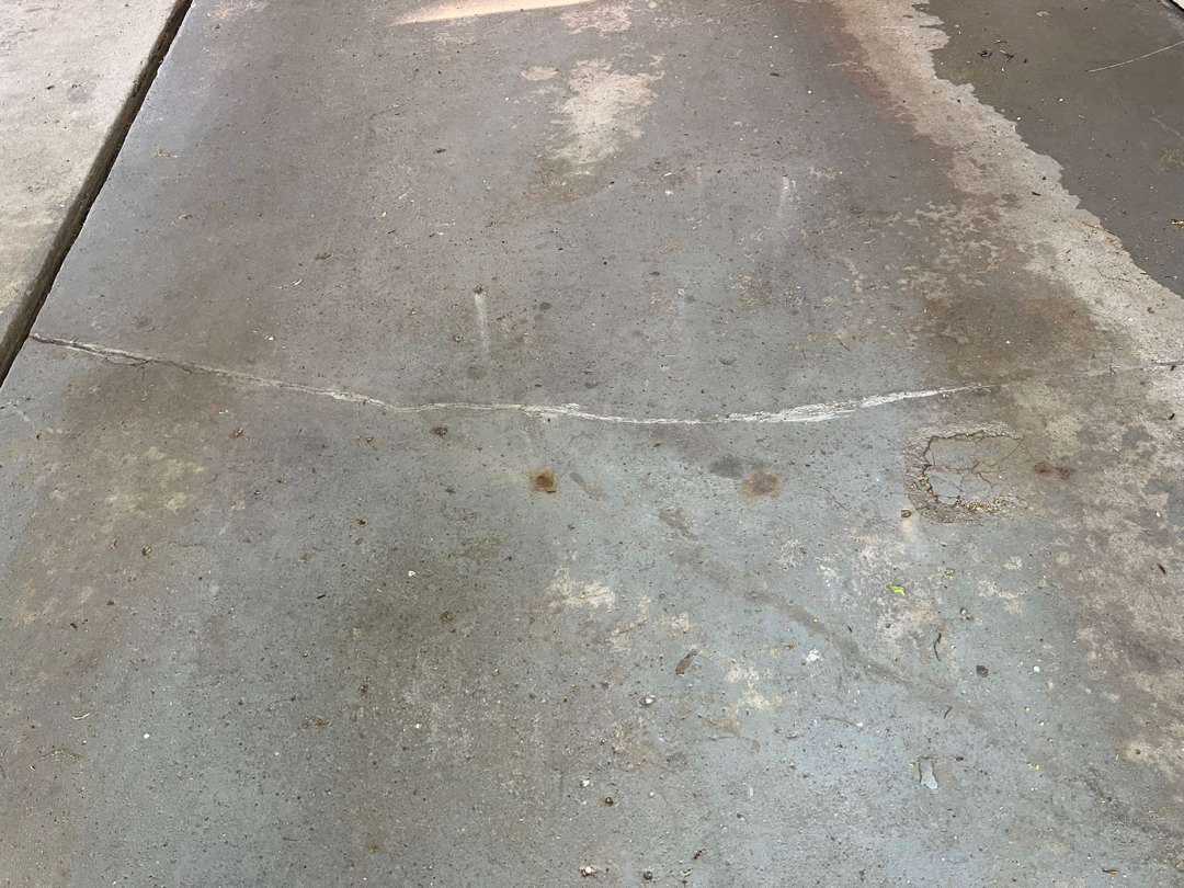 With the old coating gone, the cracks became fully visible. They ran in branching patterns across multiple slab sections — not surface-level hairlines, but open splits that had worked their way through the concrete over time. Several cracks converged near the center of the slab, forming a branching network that required careful repair work. The front lip, already flagged before the job started, confirmed the crew’s assessment: the edge had deteriorated and needed rebuilding before it could accept a coating.