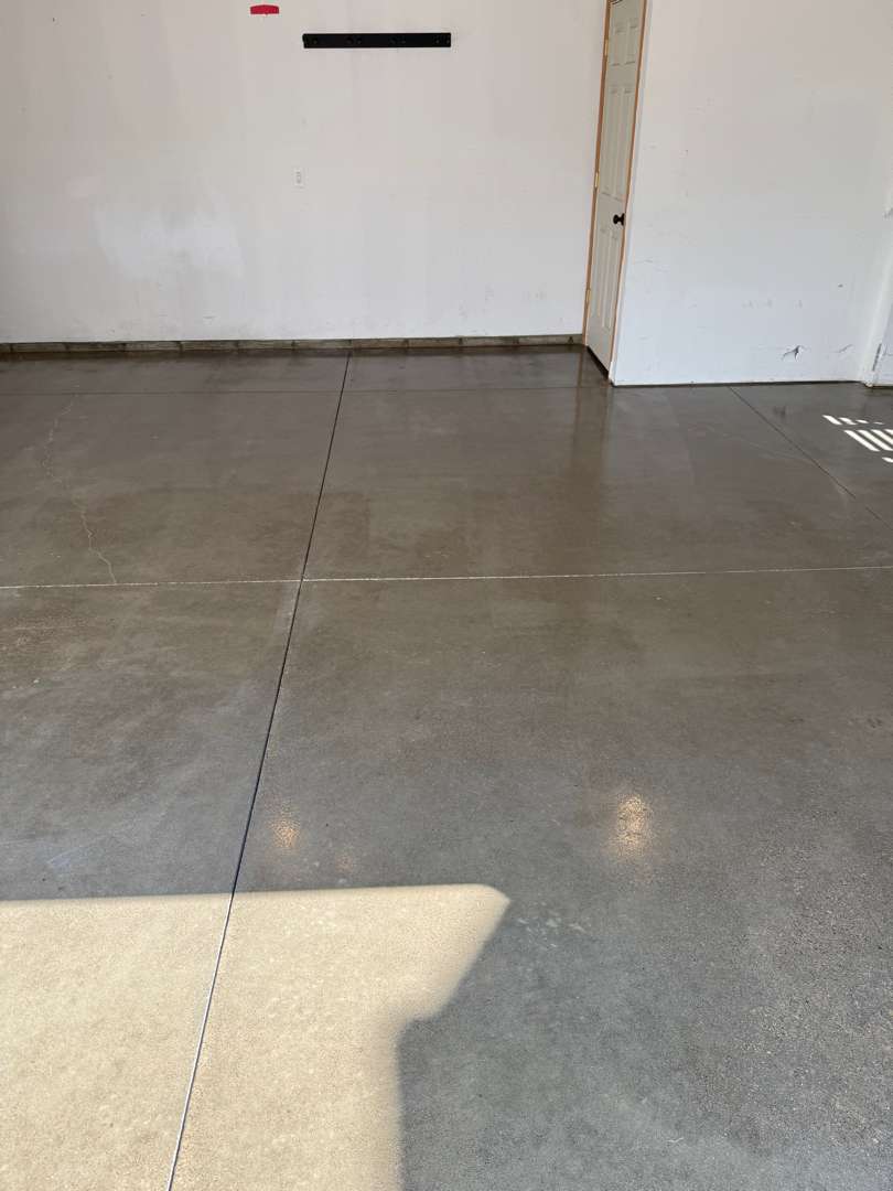 Our crew ground the slab to open the surface pores and remove the laitance layer. Even on brand new concrete, this step is essential. The laitance — the weak surface layer left over from the curing process — must be removed for the coating system to bond properly. Grinding also addressed the foam sealant along the wall base, clearing it from the perimeter so the coating could run cleanly to the edges.