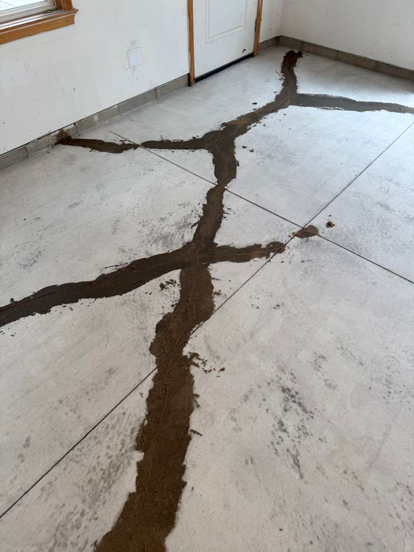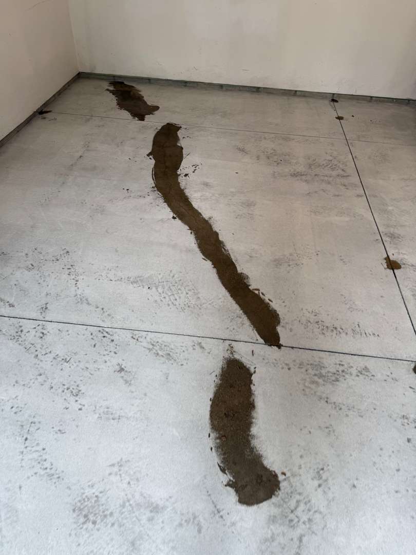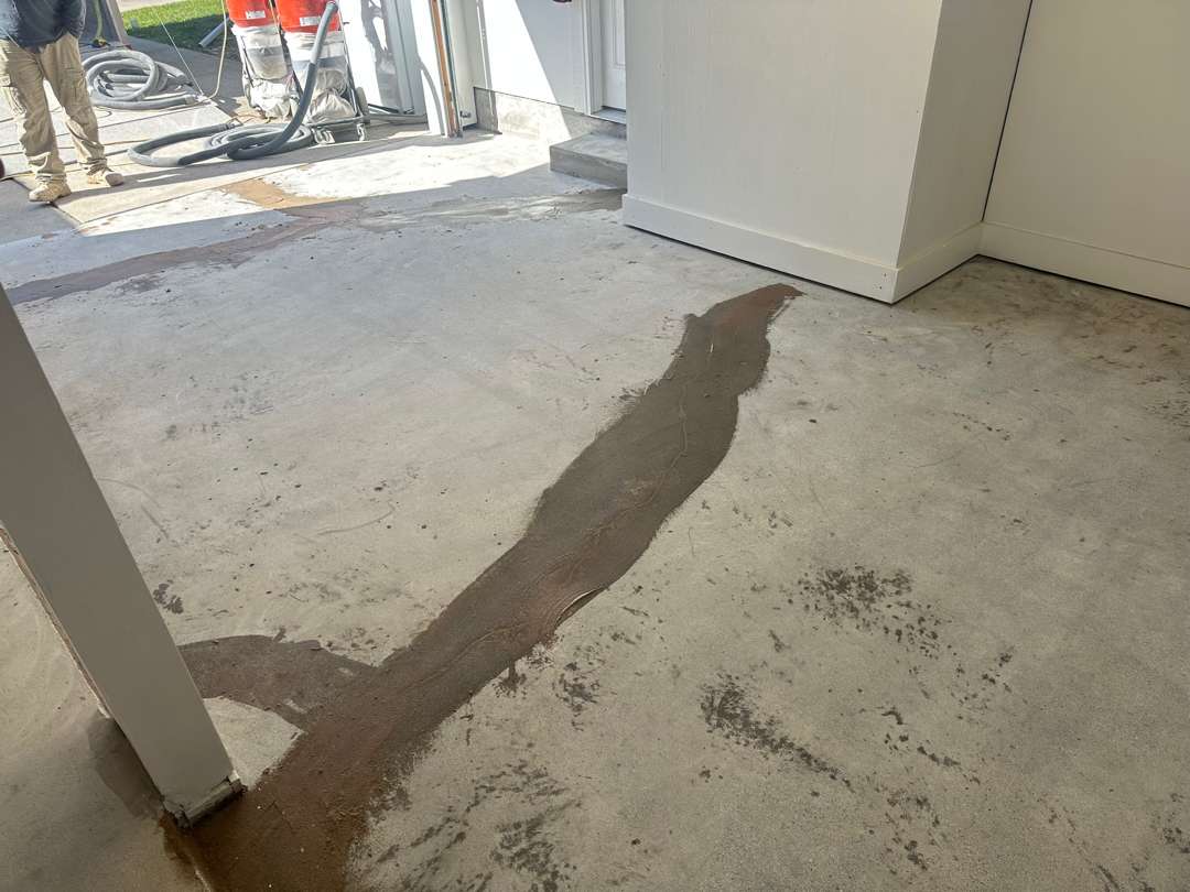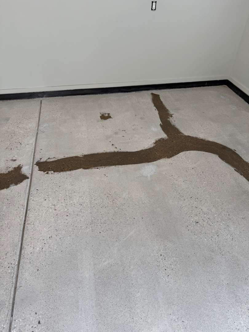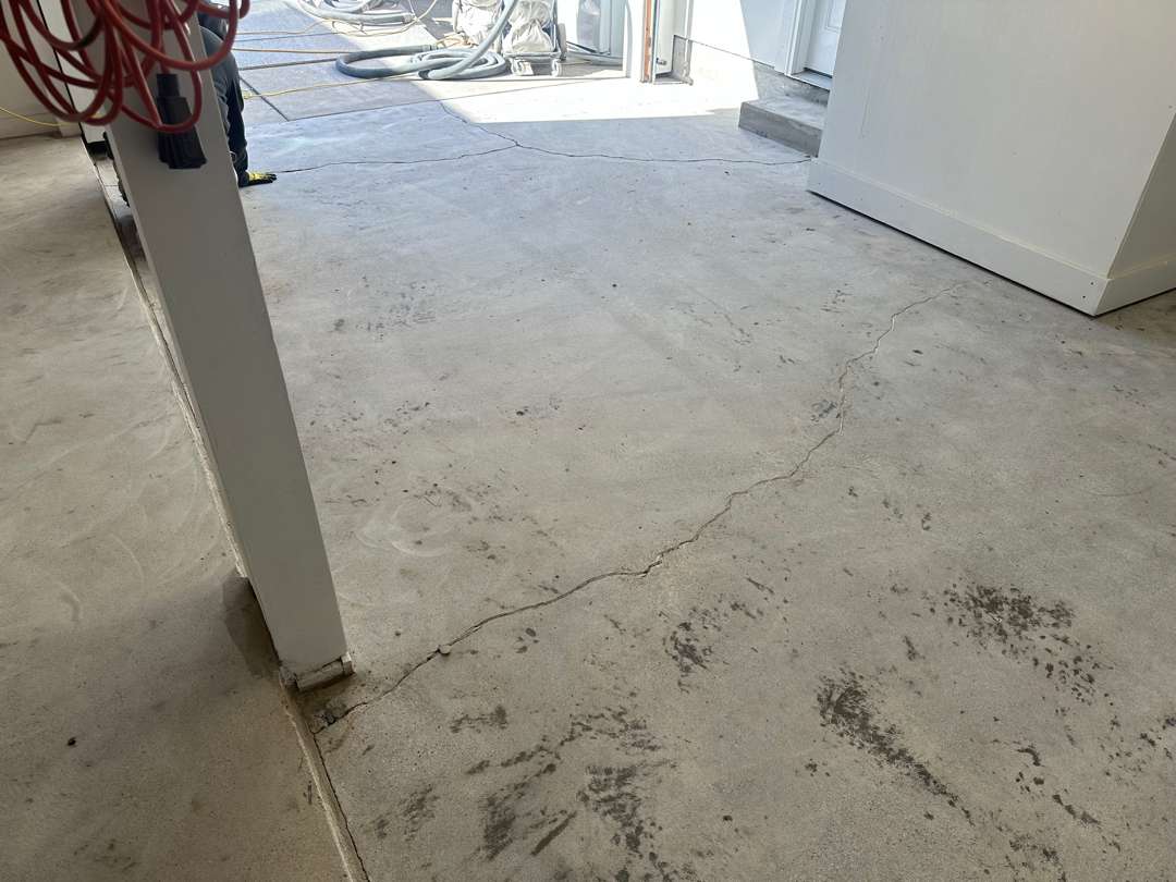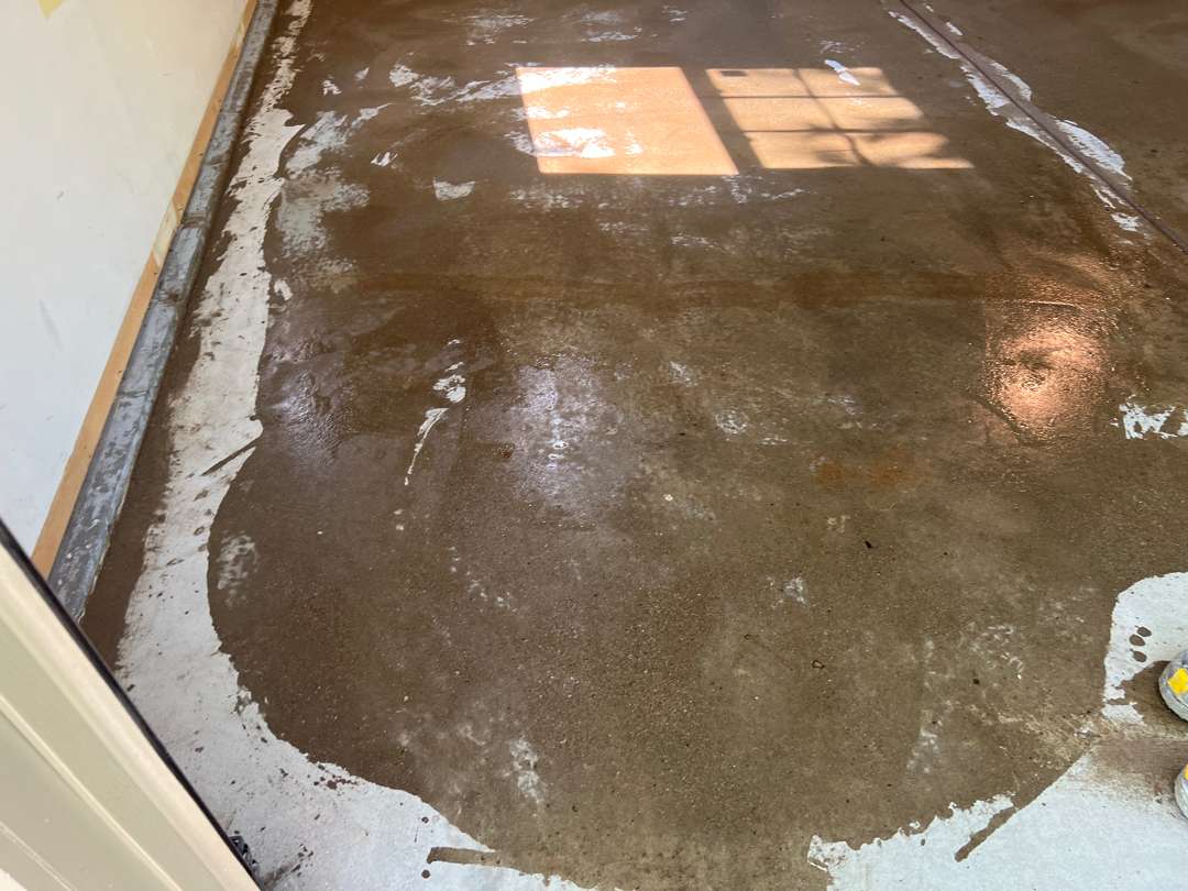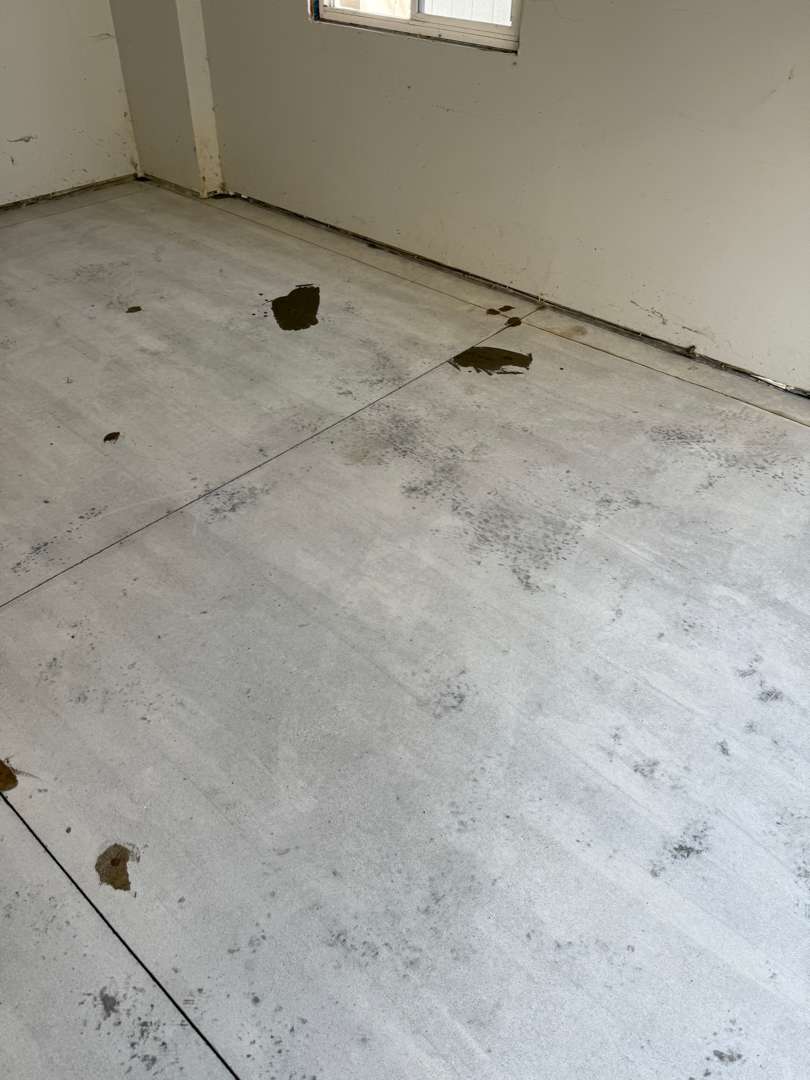 Our crew ground the slab to remove the construction contamination. Diamond grinding cut through the drywall residue, paint, and surface debris. The grinding photos show dark slurry pulling off the slab. That slurry was construction contamination. Left in place, it would prevent proper adhesion. Our crew worked across every section until the surface was clean and open.