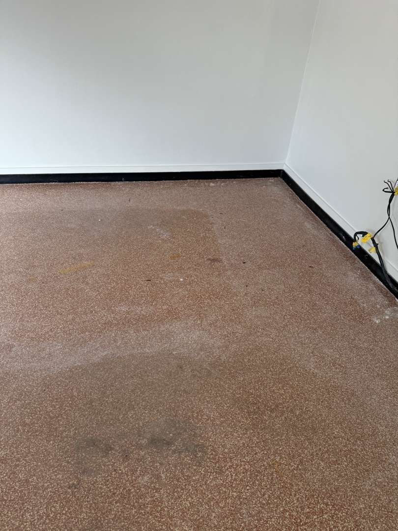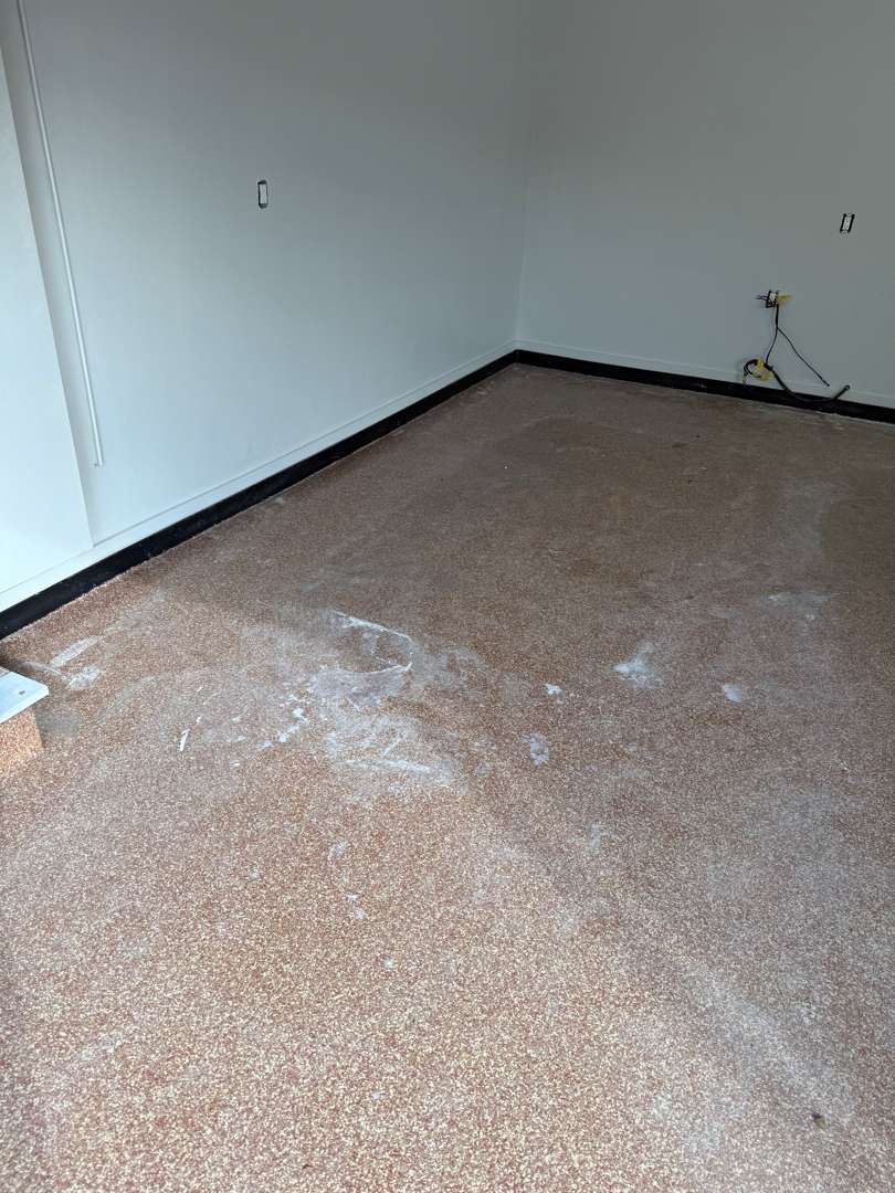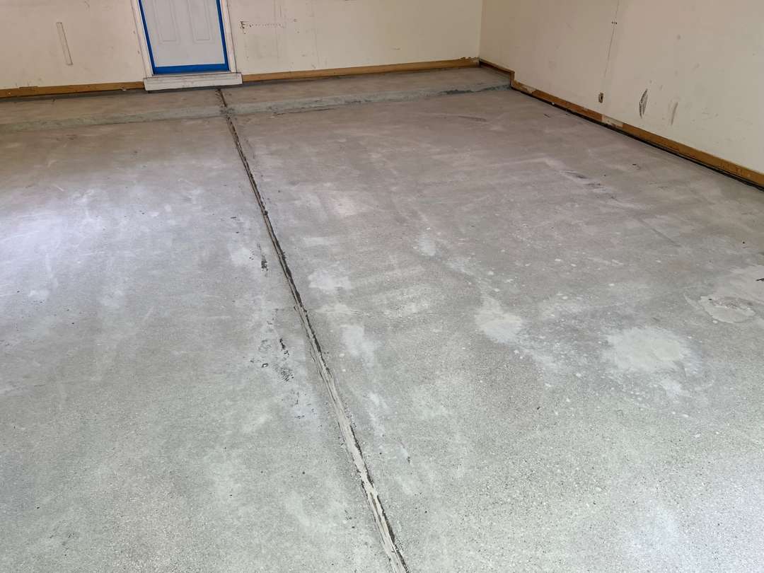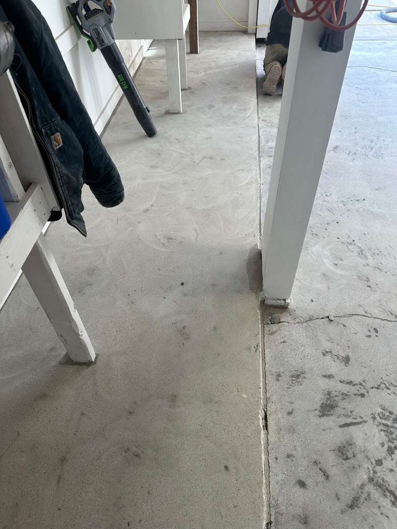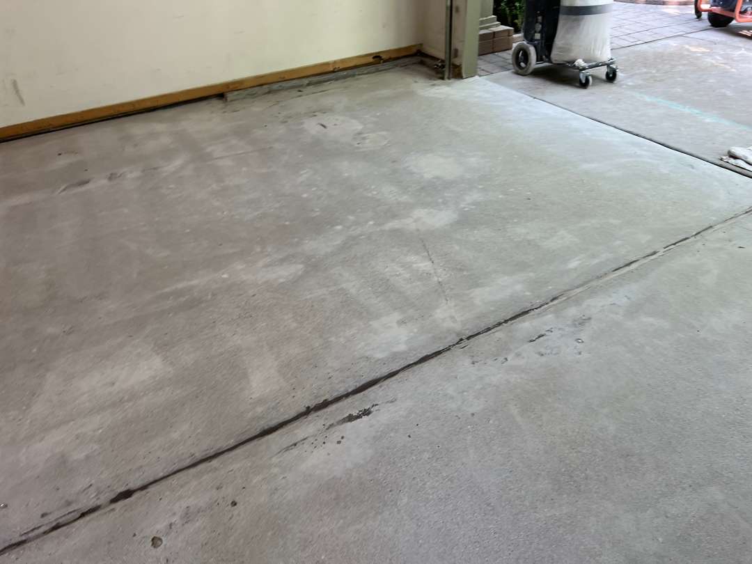 With the repairs cured, our crew ran a second grind across the full 377 square feet. This pass brought the patched areas flush with the surrounding concrete and produced a consistent surface profile from edge to edge. The floor came out of this phase flat, clean, and ready. No high spots. No loose material. Nothing left that would compromise the system above it.