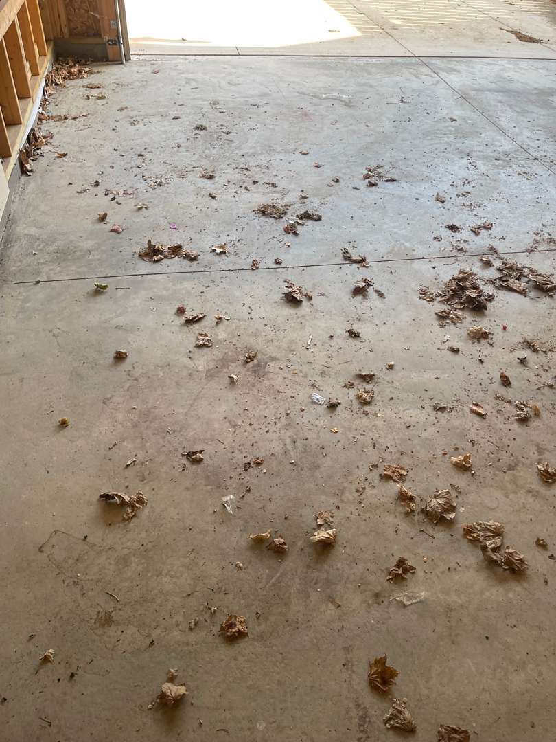 Our crew arrived at this Ridgedale Avenue property during an active renovation. The garage walls were in the drywall mud and tape stage. Wooden shelf framing lined the walls. The 350-square-foot concrete slab was brand new. No prior coating, no structural damage, no cracking. What covered the floor was debris — dead leaves, dirt, and surface contamination that had accumulated while the garage sat open during construction.