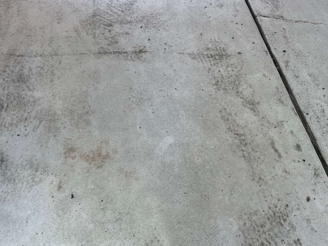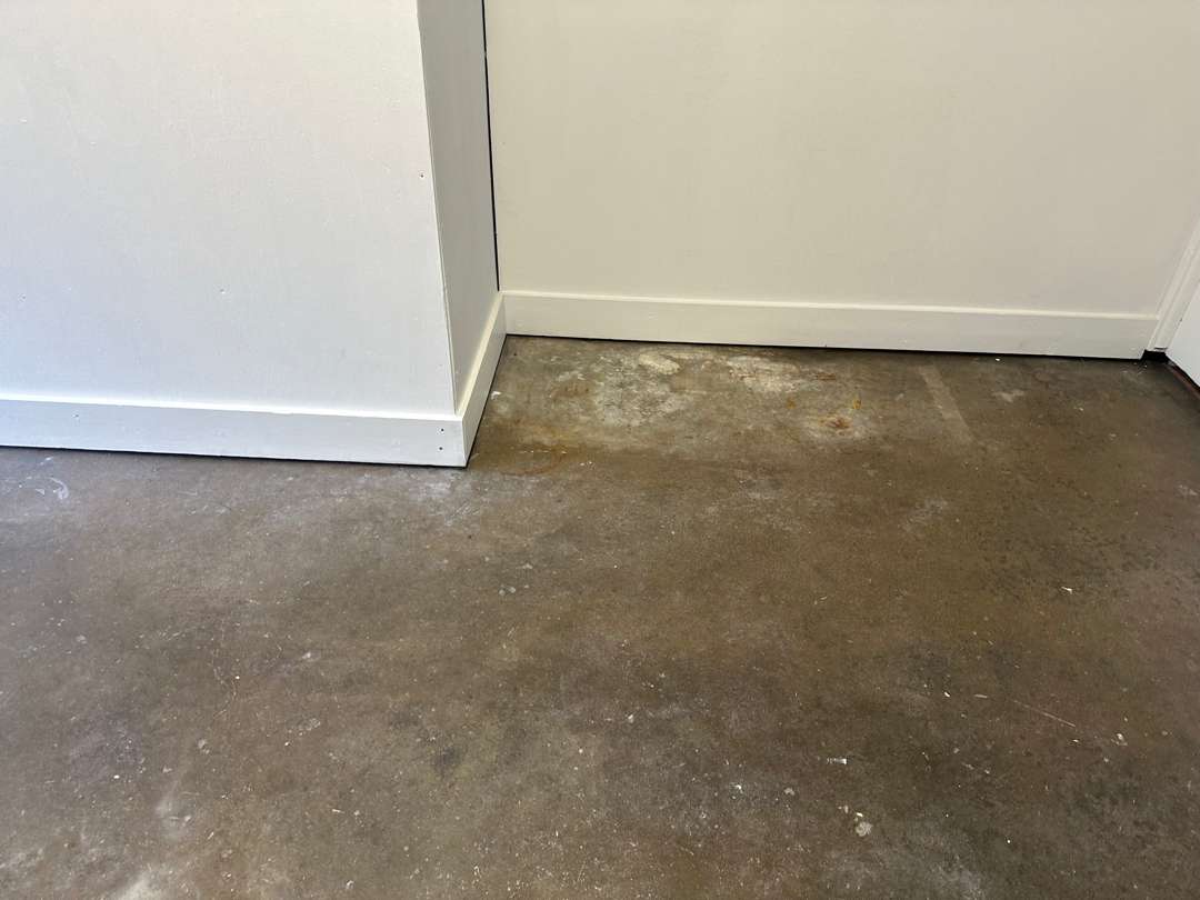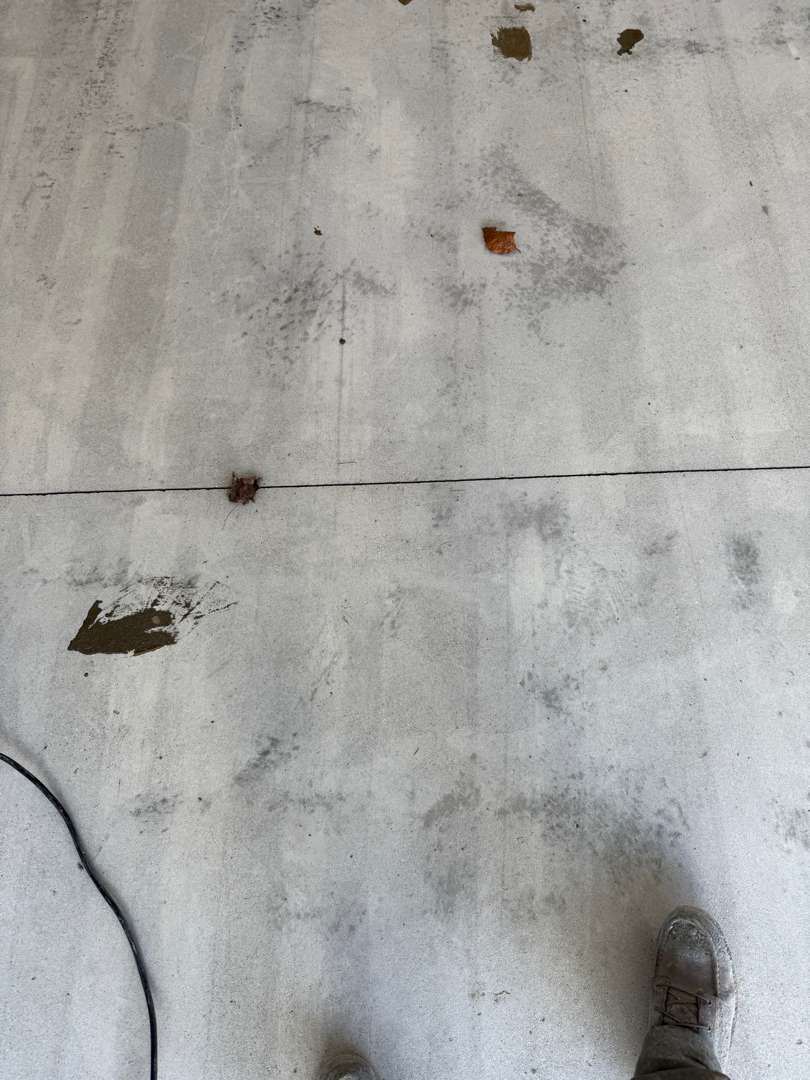 The two nicks in the concrete were small but required attention. Our crew applied mender compound to each one and leveled it flush with the surrounding slab. The patch photos show the brown compound spotted across the otherwise clean, open surface. With repairs complete, the floor was consistent and ready.