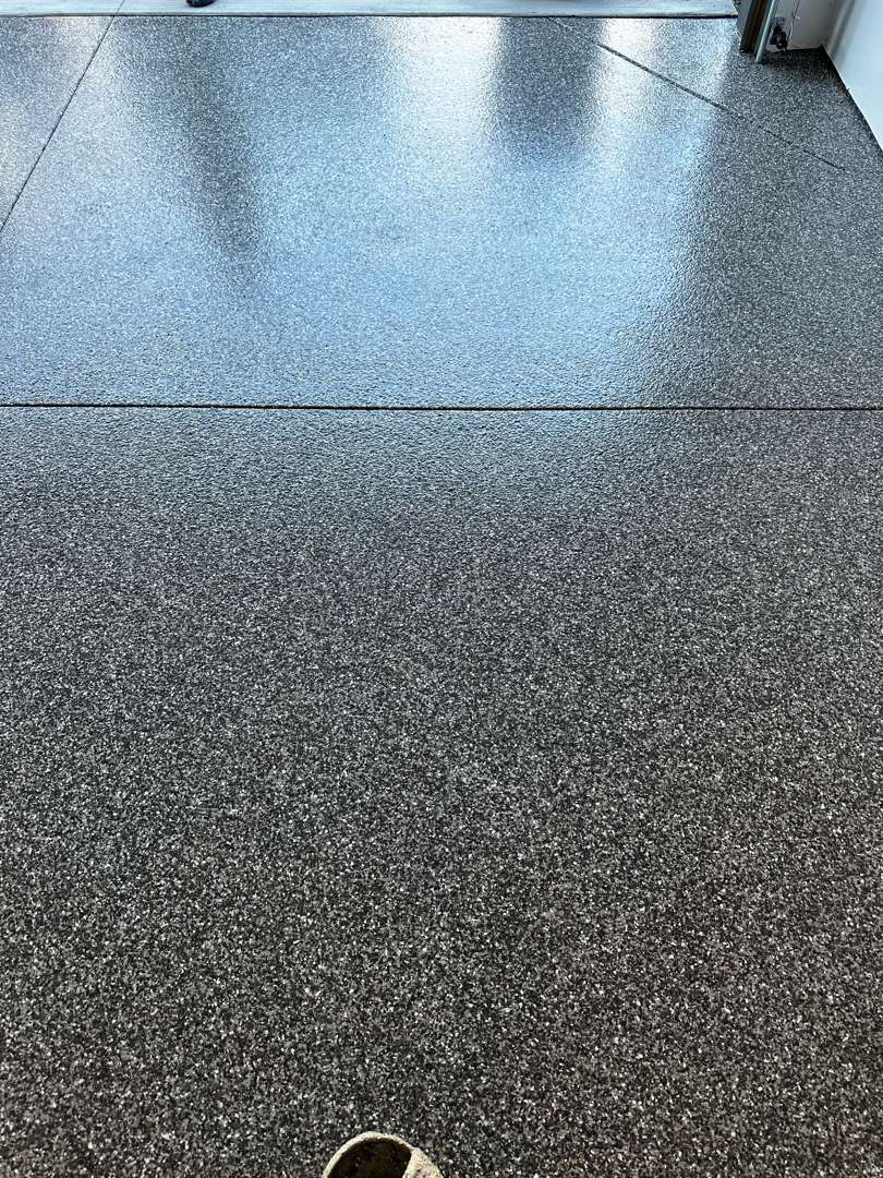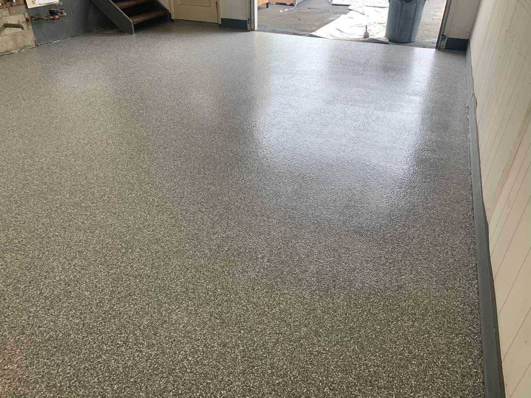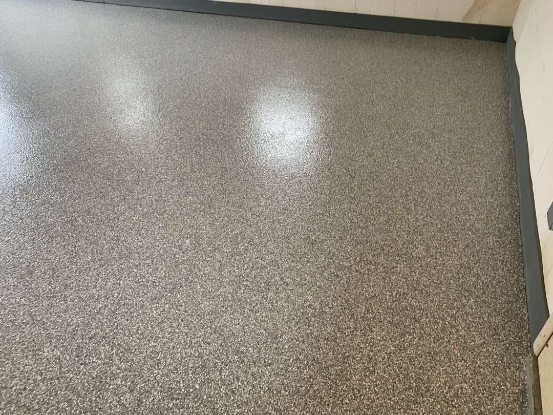 The finished floor on Vanderpool Avenue is a clear transformation from what our crew found on arrival. Stoney Creek flake now covers what was a worn, patched, and deteriorating slab mid-renovation. The charcoal tone gives the space a clean, finished character. The 16-grit traction provides reliable grip underfoot. The floor is sealed, protected, and ready for years of use.