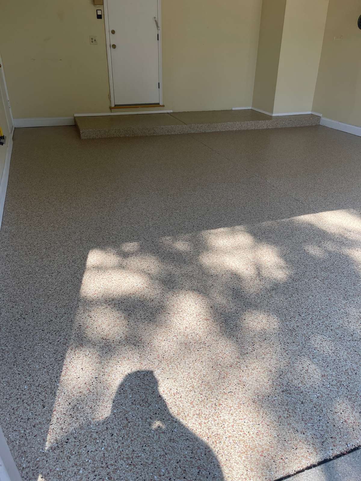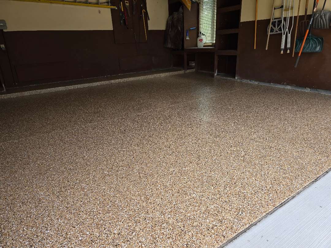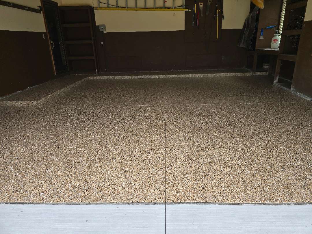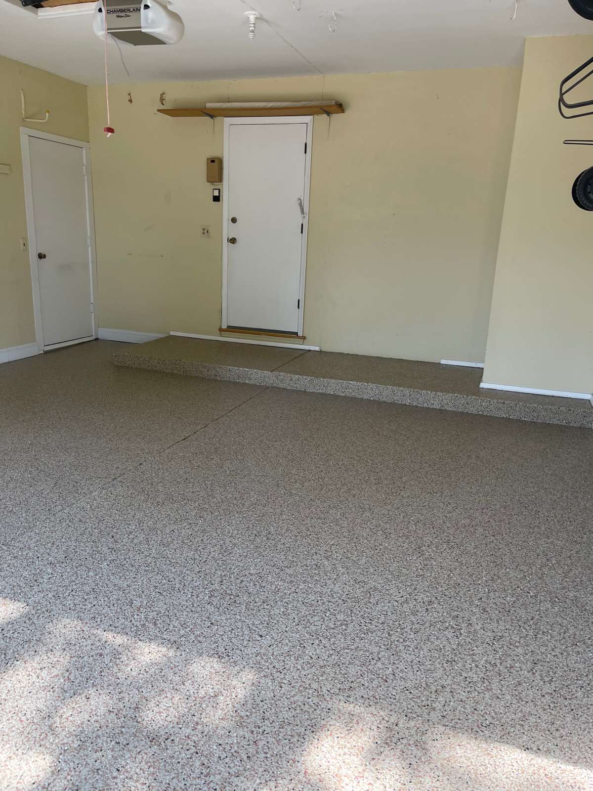 The homeowners selected Pecan — a warm blend of tans, browns, and creams with multi-color flecks throughout. Our crew applied the MC-3.5 polyurea-polyaspartic coating system across the prepared 334 square feet. Our team broadcast the decorative flake into the wet base coat. Our crew brought the coating up and over the 17-linear-foot step-up platform along the back wall, covering both the face and the surface to match the main floor. They then applied the heavy clear topcoat to lock in the flakes and seal the surface throughout.