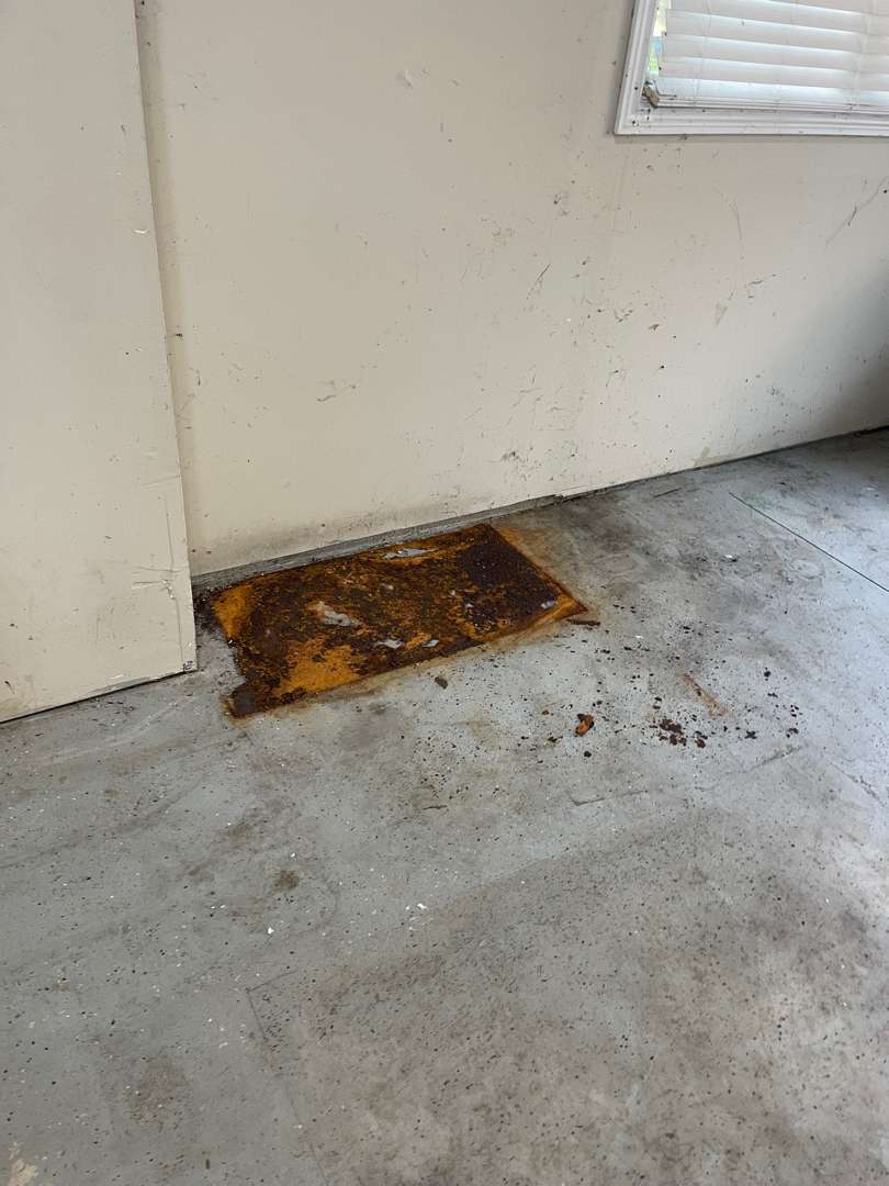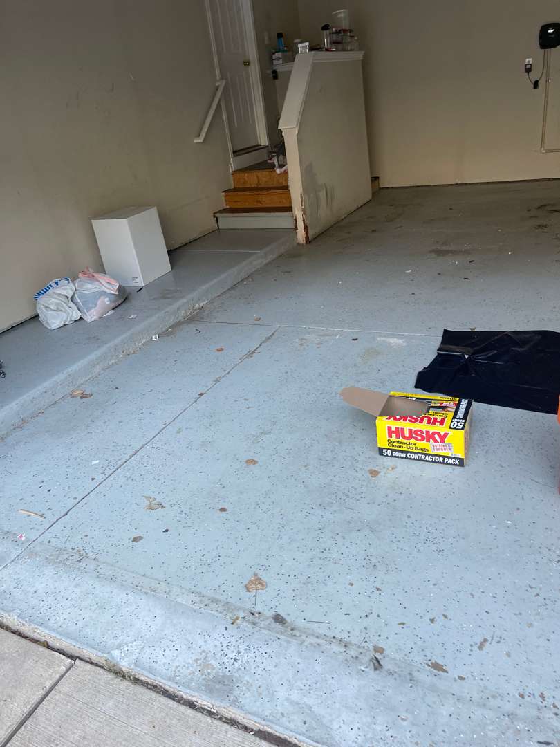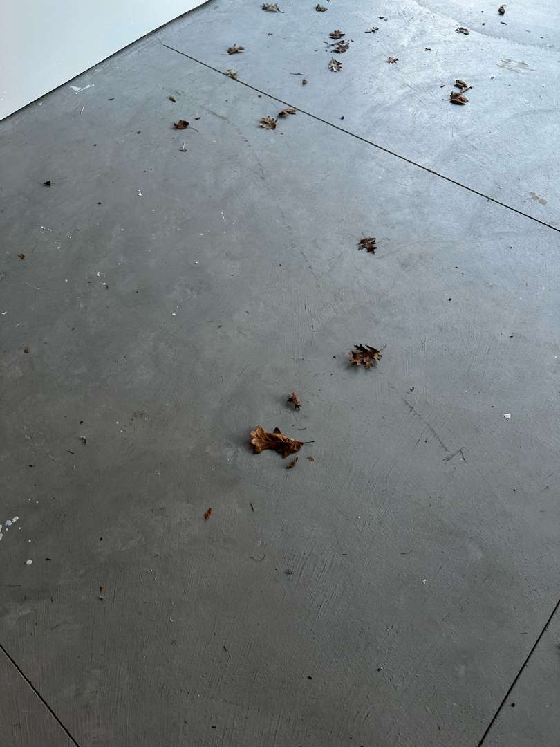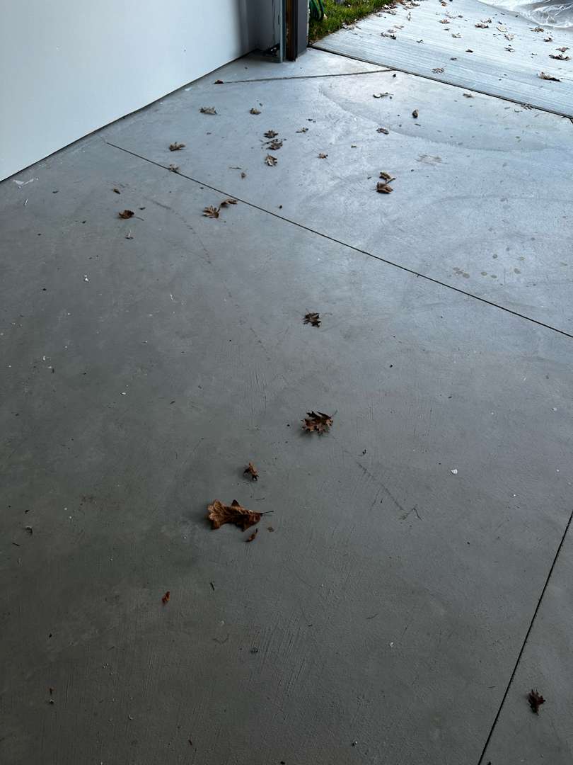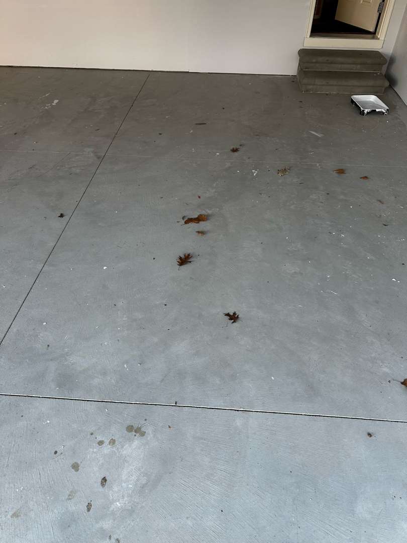 Our crew arrived at this Audley Court property to find a 573-square-foot garage on brand new concrete. The slab showed no staining, no cracking, and no structural damage. What covered the surface was seasonal debris — fallen leaves and light dirt that had accumulated while the garage sat open. Two concrete steps lead to the interior door. No vertical lip work was included in the scope. The job called for a clean installation on sound, freshly poured concrete.