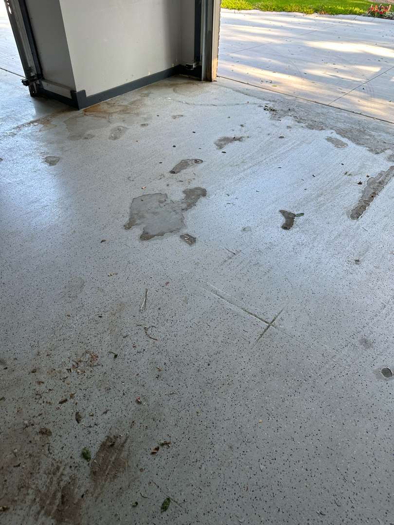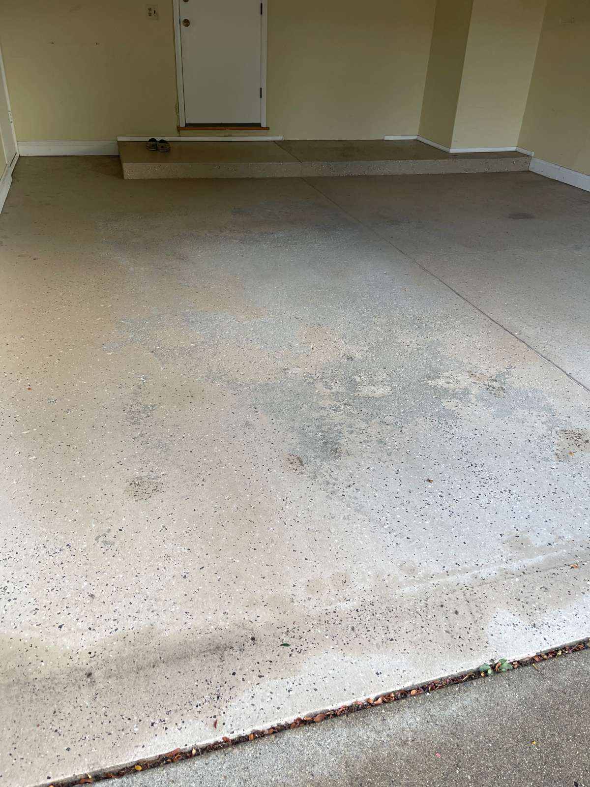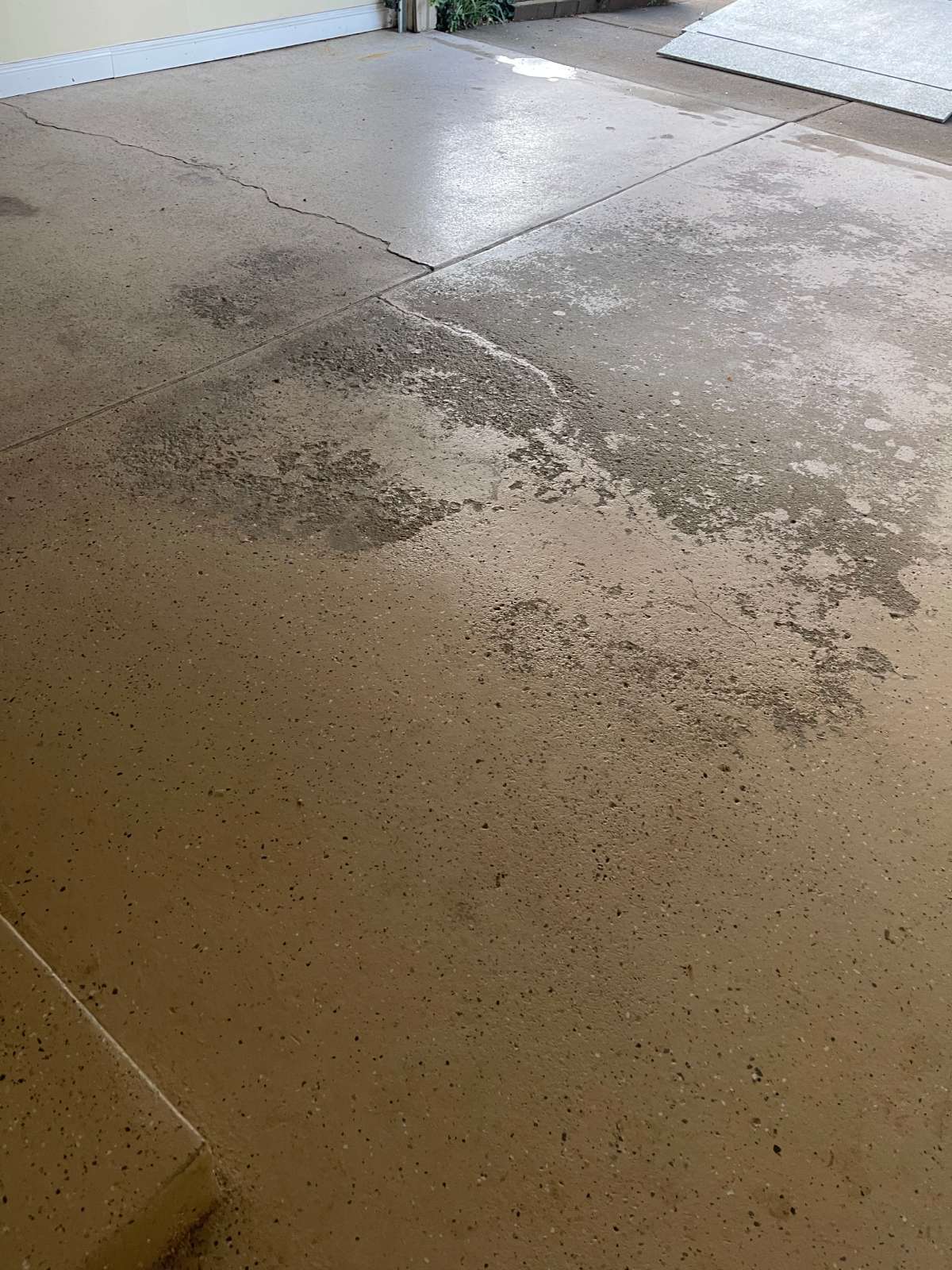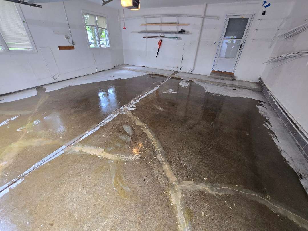 Winter road salt, freeze-thaw cycles, automotive fluids, and daily vehicle traffic degrade unprotected garage concrete over time. The damage typically appears as oil staining, cracking, surface pitting, and adhesion failure in previously coated floors.