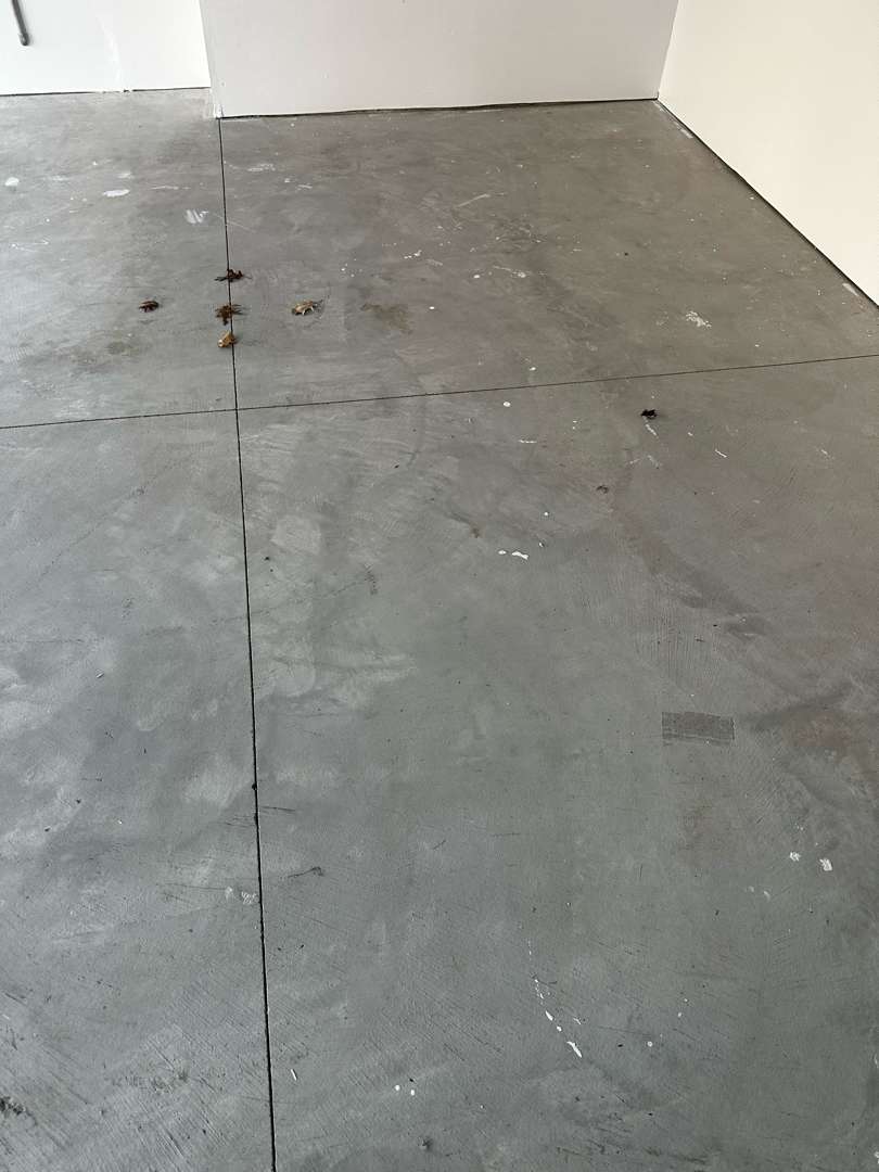 Our crew cleared the debris from the full surface before grinding began. Even on brand new concrete, diamond grinding is necessary. The laitance layer left over from the curing process must be removed before any coating system can bond properly. Our team ground the full 573 square feet to open the surface pores and create the mechanical profile the MC-4 system requires. Our crew vacuumed thoroughly after each pass. The slab came out of preparation clean, profiled, and ready.