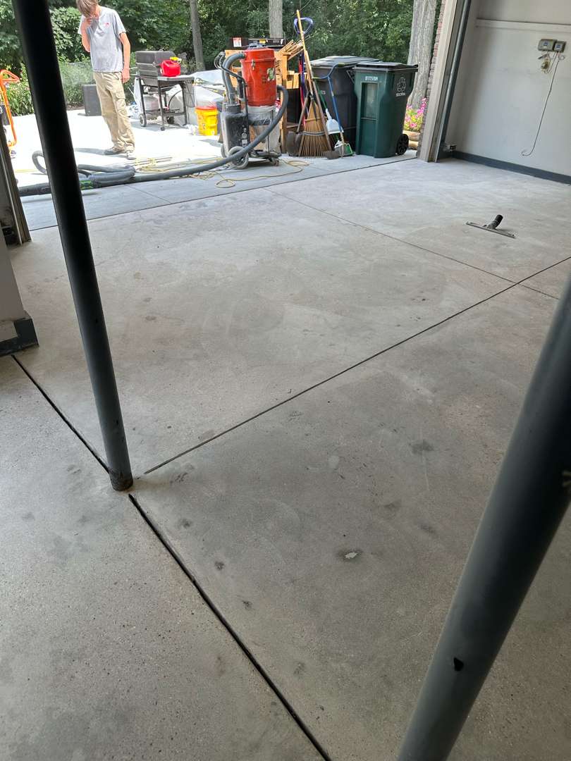 Our crew ground the full slab to remove the failed DIY epoxy coating. Diamond grinding cut through the residue and opened the surface of the concrete beneath. Our team worked across all 334 square feet until the slab was clean and free of the old material. The grinding also revealed the full extent of the cracks and the heavier pitting in the parking zone. Our crew vacuumed the surface thoroughly before moving to the repair phase.