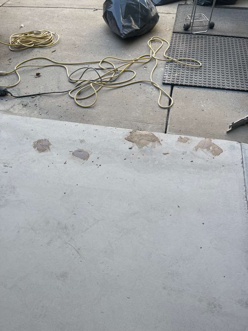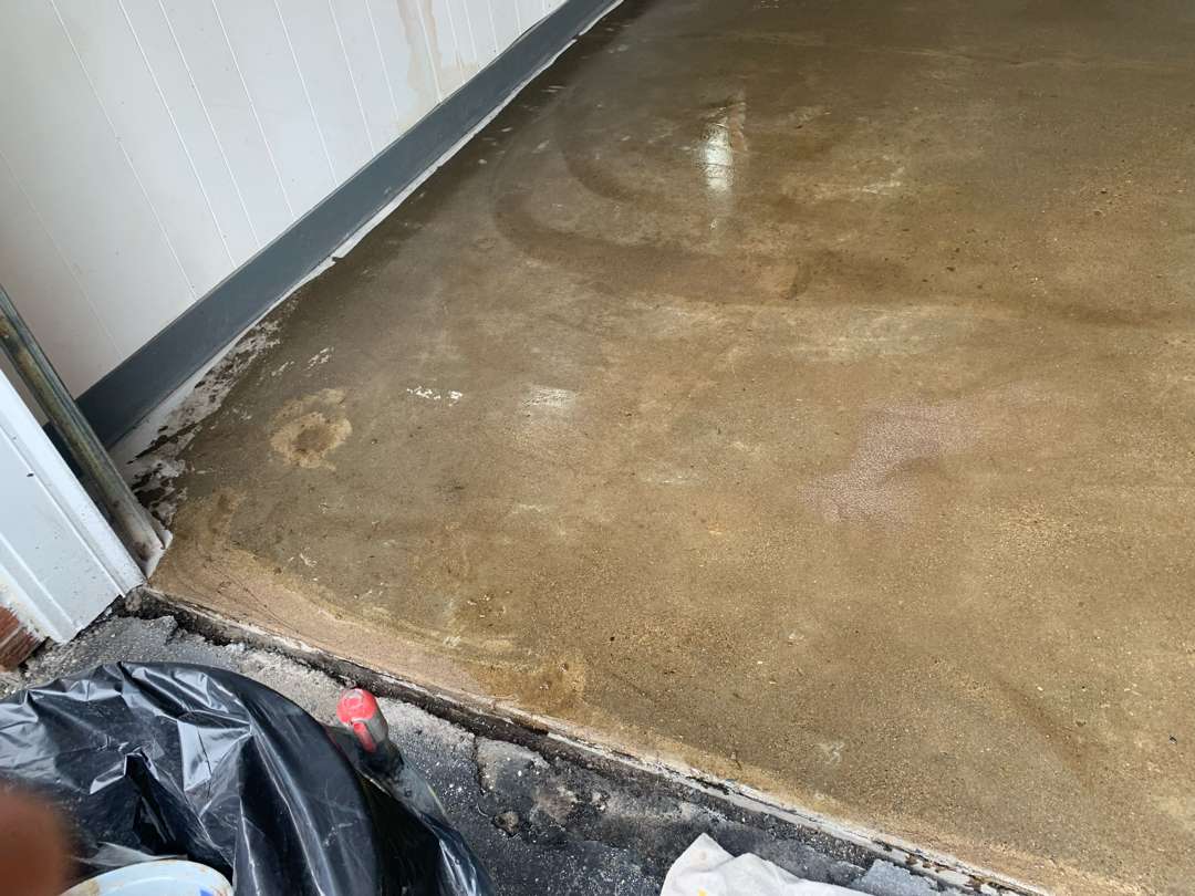 The two concrete steps leading to the interior door were included in the scope. Our crew abraded each tread and riser by hand to prepare the surfaces for coating. Hand preparation on steps ensures full coverage on the nosing and edges where a grinder cannot reach. Both steps were cleaned and confirmed ready before the base coat went down.