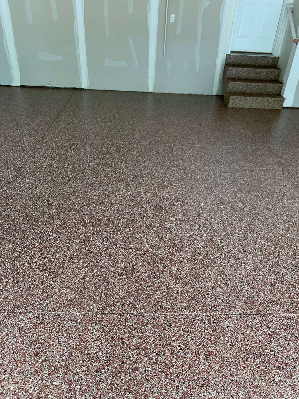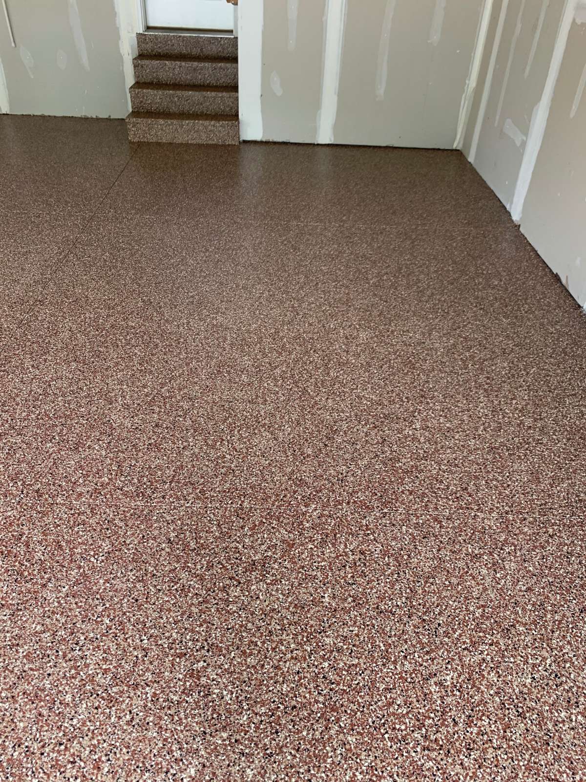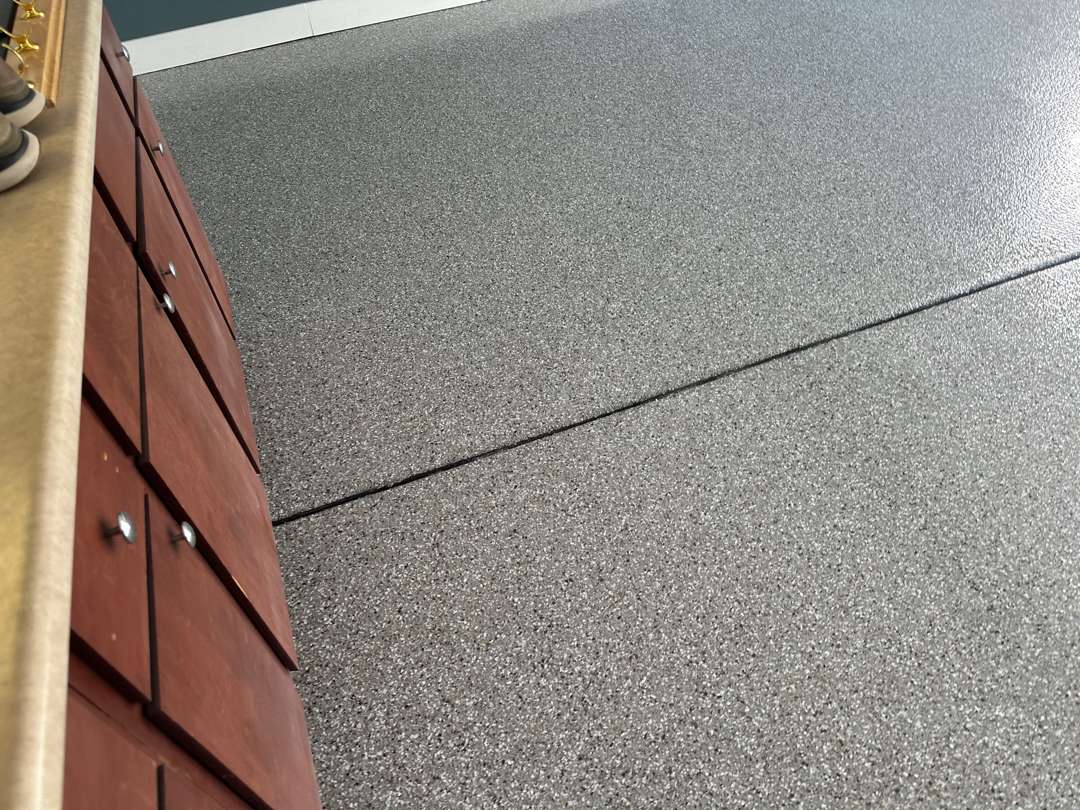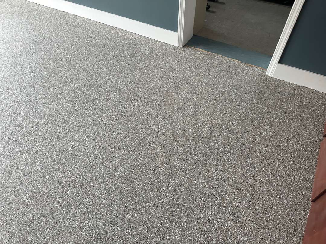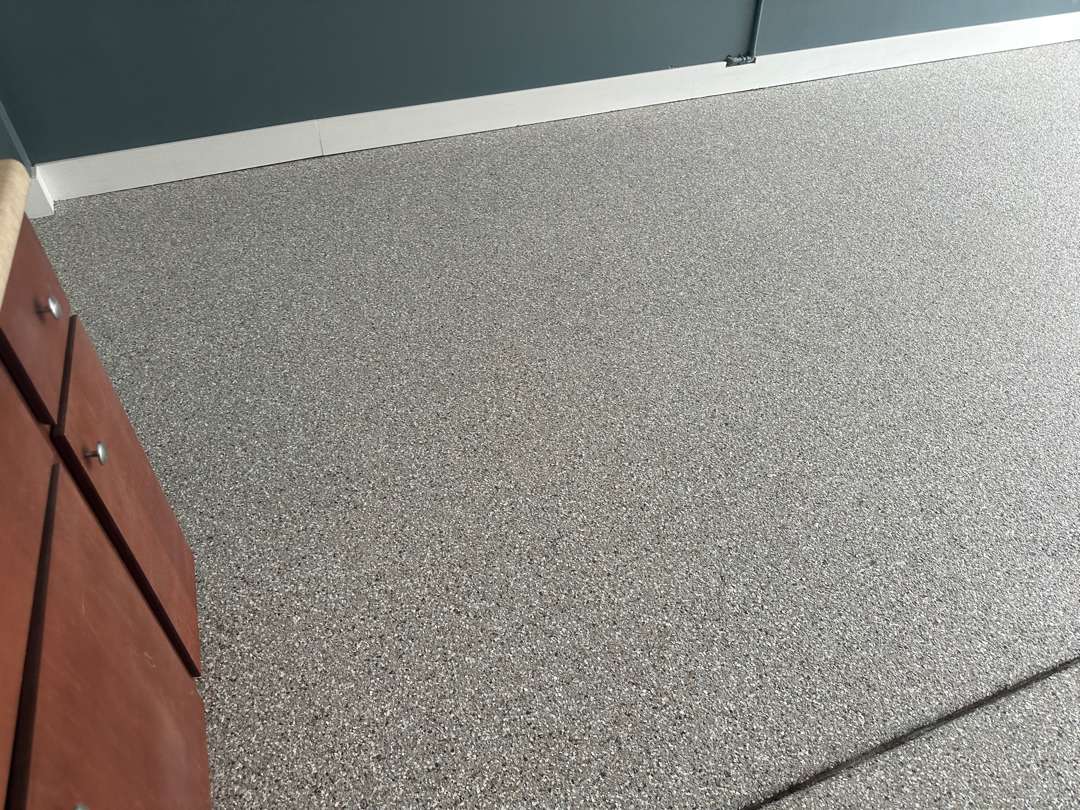 Our crew applied the MC-4 polyurea-polyaspartic coating system across the prepared 365 square feet. Our team broadcast the decorative flake into the wet base coat across the floor and along the vertical surfaces. They then applied the clear topcoat with Shark Grip traction additive throughout. The coating runs wall to wall across the full scope.