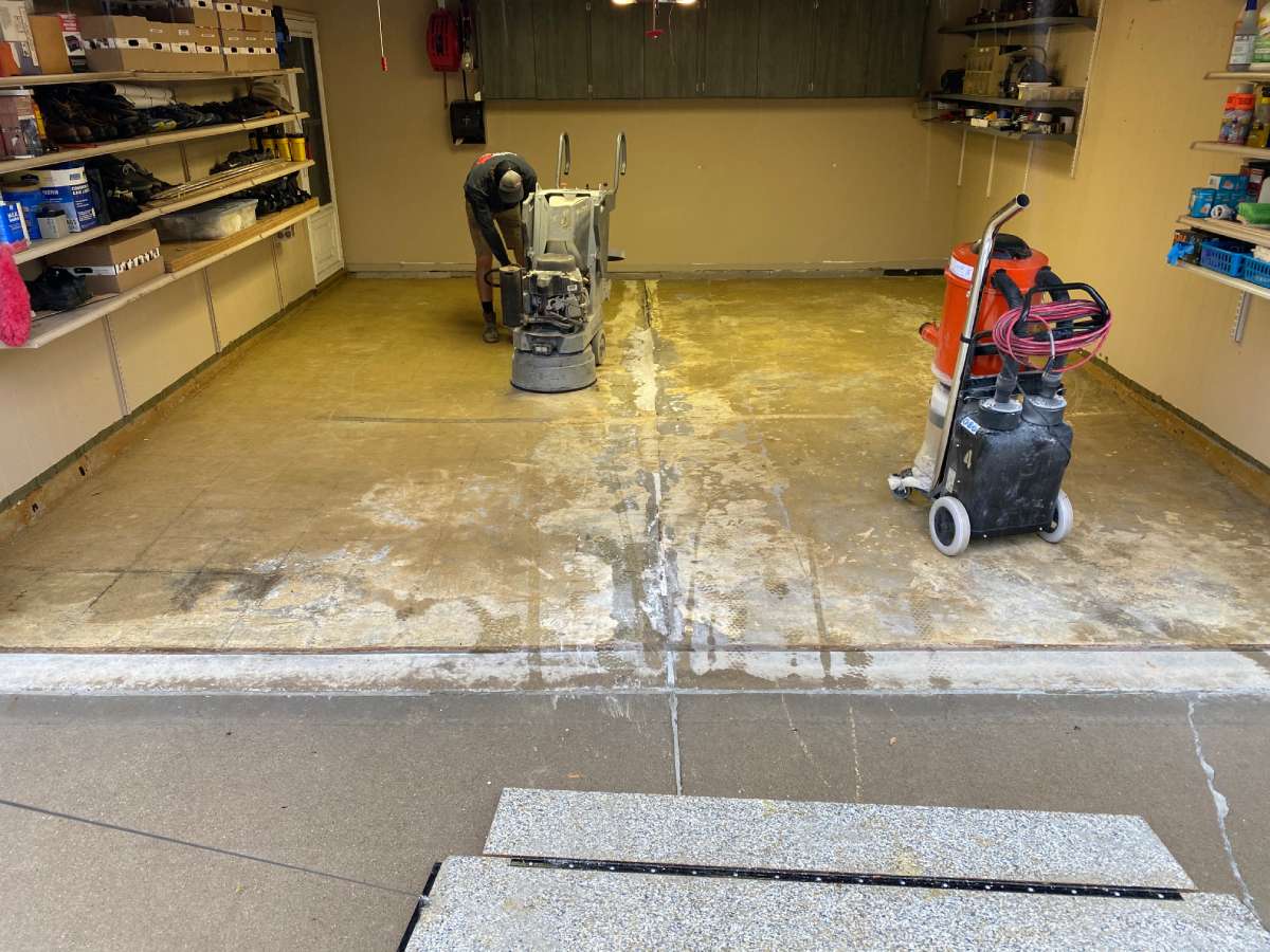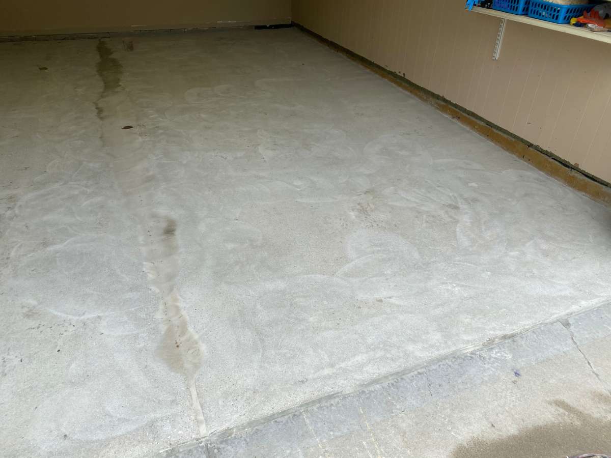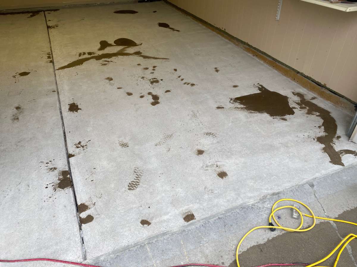 Winter road salt, freeze-thaw cycles, automotive fluids, and daily vehicle traffic degrade unprotected garage concrete over time. The damage typically appears as oil staining, cracking, surface pitting, and adhesion failure in previously coated floors.