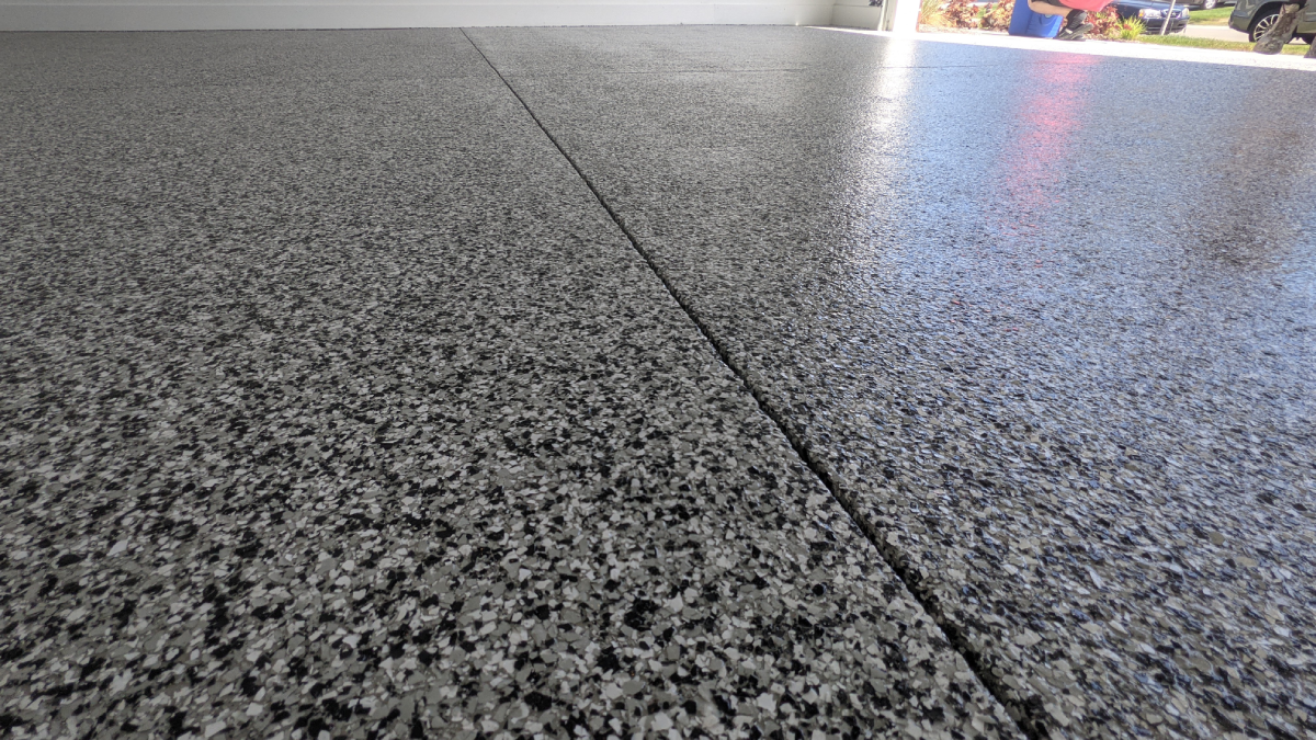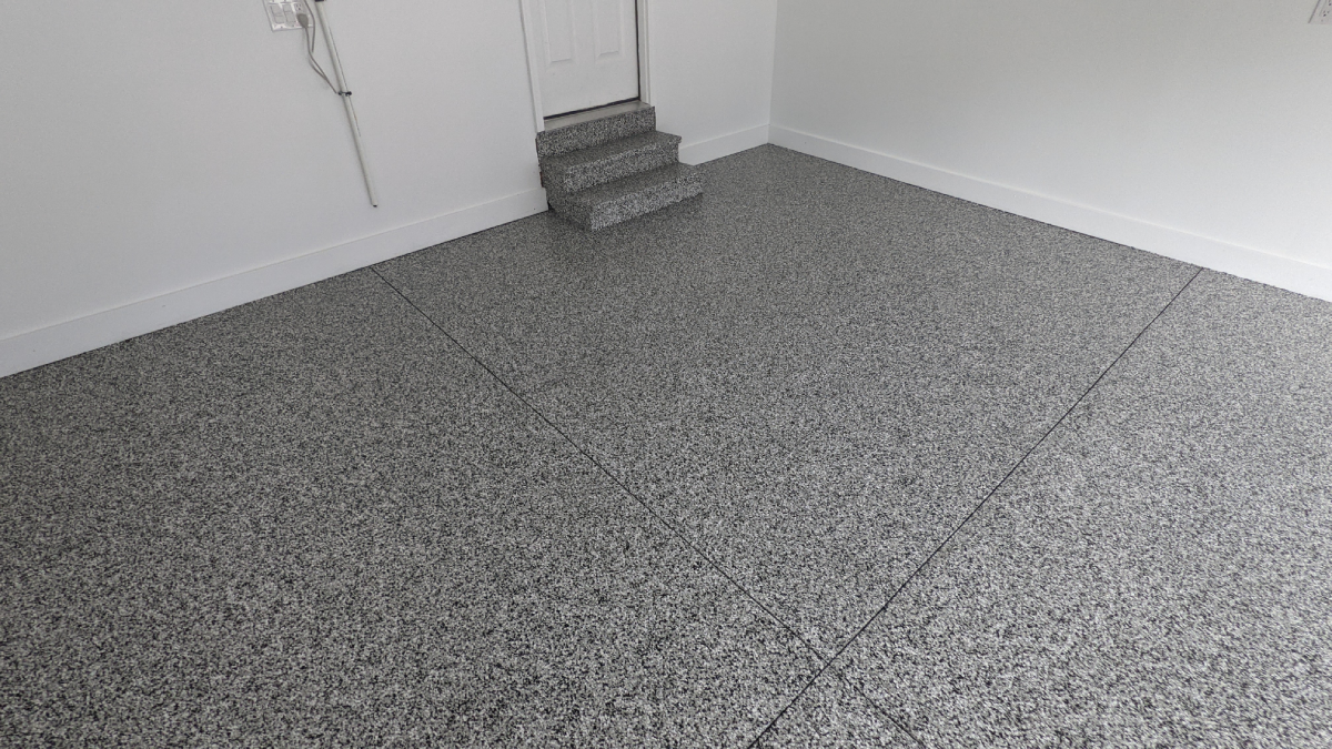 The homeowner chose the Domino flake color on a grey base—a bold, high-contrast palette that would bring dramatic new life to this hardworking space.