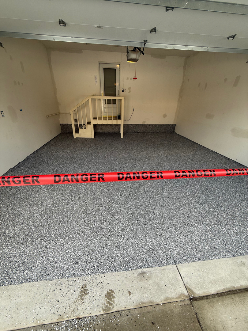 Most importantly, this floor is now fully armored against demanding weather conditions—road salt, motor oil, hot tire pickup, chemical spills, and freeze-thaw cycles won’t penetrate this professionally installed polyurea/polyaspartic coating system. The homeowner can maintain the appearance of their garage floor with nothing more than simple sweeping and occasional mopping for years to come.