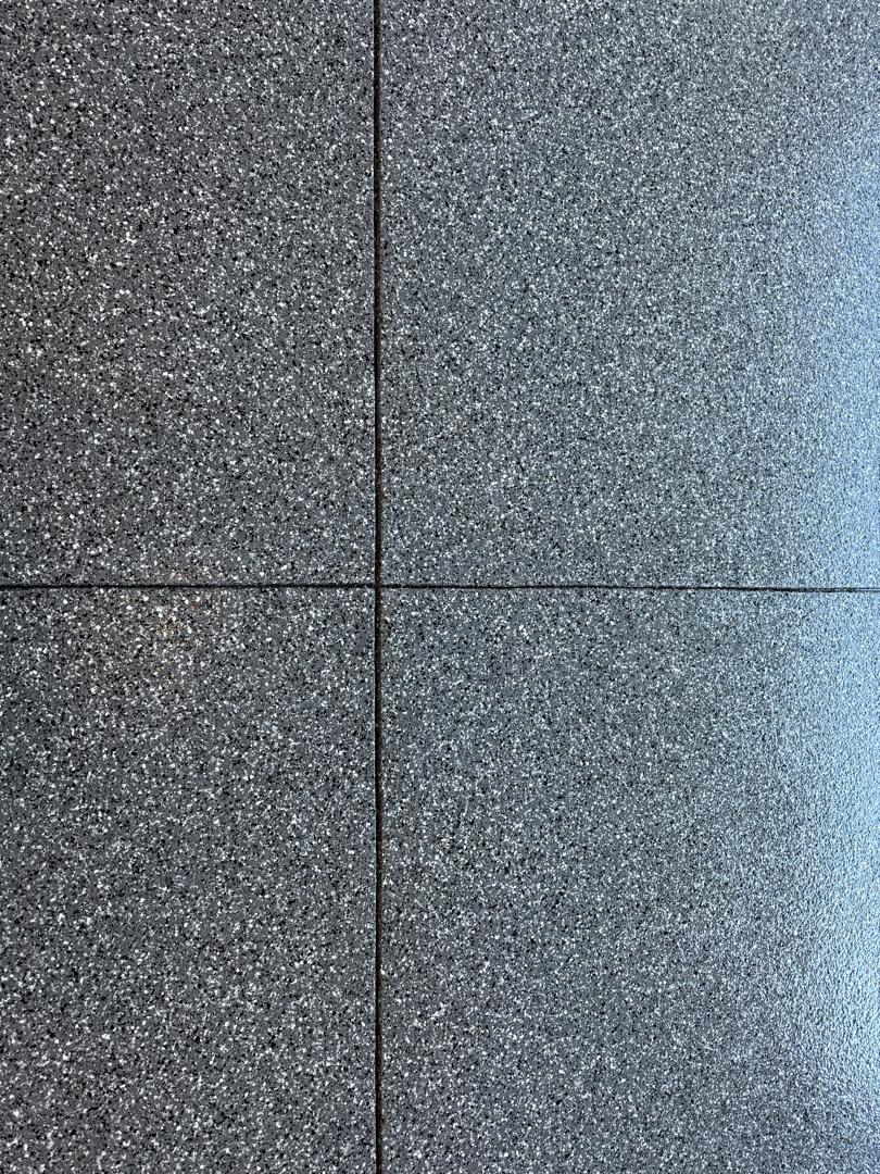 While the base coat remained wet, the team immediately broadcast the Smoke decorative flake blend across the entire surface. The Smoke palette is a fine-grain blend dominated by deep charcoal and dark grey tones with subtle silver and white accents—creating a refined, almost stone-like appearance that reads darker and more uniform than coarser flake blends.