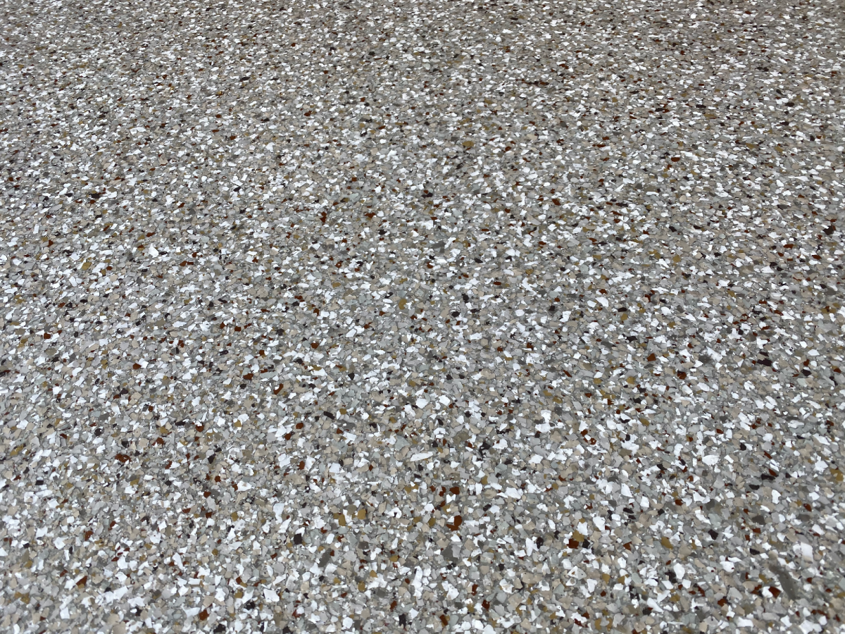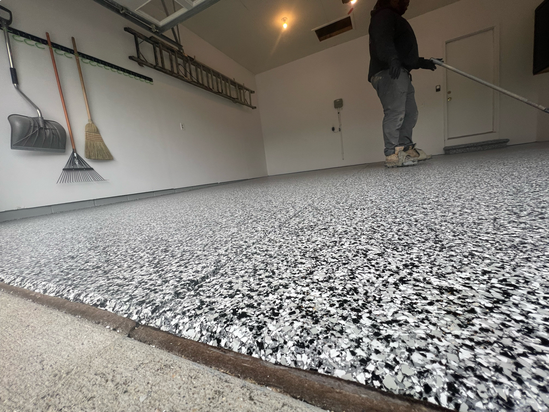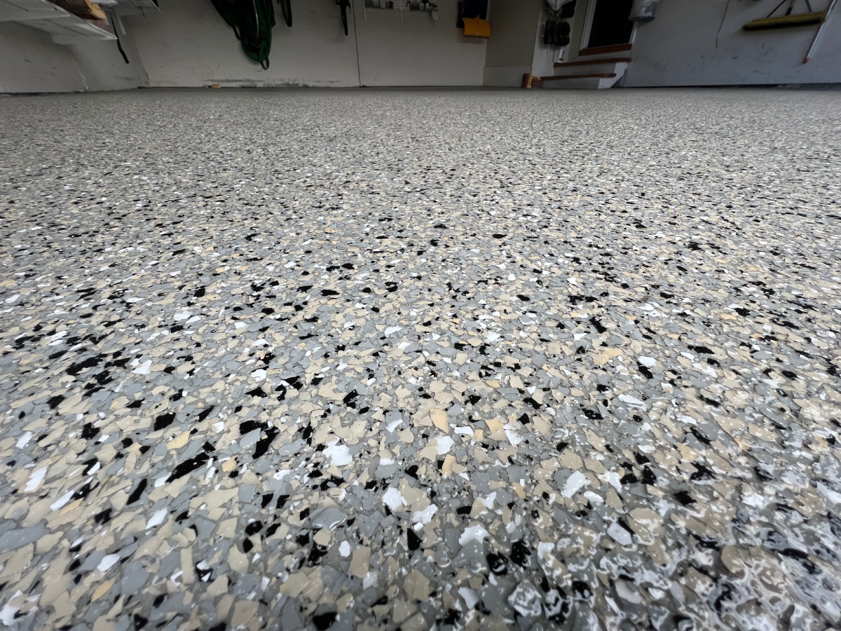 While the base coat remained wet, the team immediately broadcast the Pebble Beach decorative flake blend across the entire surface, including the concrete step at the interior door. The Pebble Beach palette features a mix of cool grey, white, and silver tones punctuated by warm brown and maroon accents—creating a natural, stone-like appearance with rich visual depth. The multi-tonal flakes settled into the wet base coat and locked into place, building the textured, multi-dimensional surface that defines a premium floor coating installation.