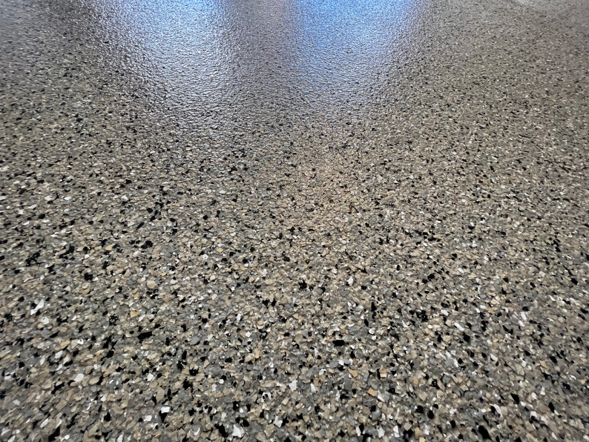 Our crew laid down generous, even passes across the entire floor and steps, encapsulating every decorative flake beneath a tough, transparent shield. As the clear coat went on, the transformation was immediate—the matte flake surface turned brilliantly glossy, and the Mediterranean color palette came alive. The warm tans deepened, the greys took on a polished sheen, and the black accents sharpened with contrast, creating a rich, multi-dimensional finish beneath the protective layer.