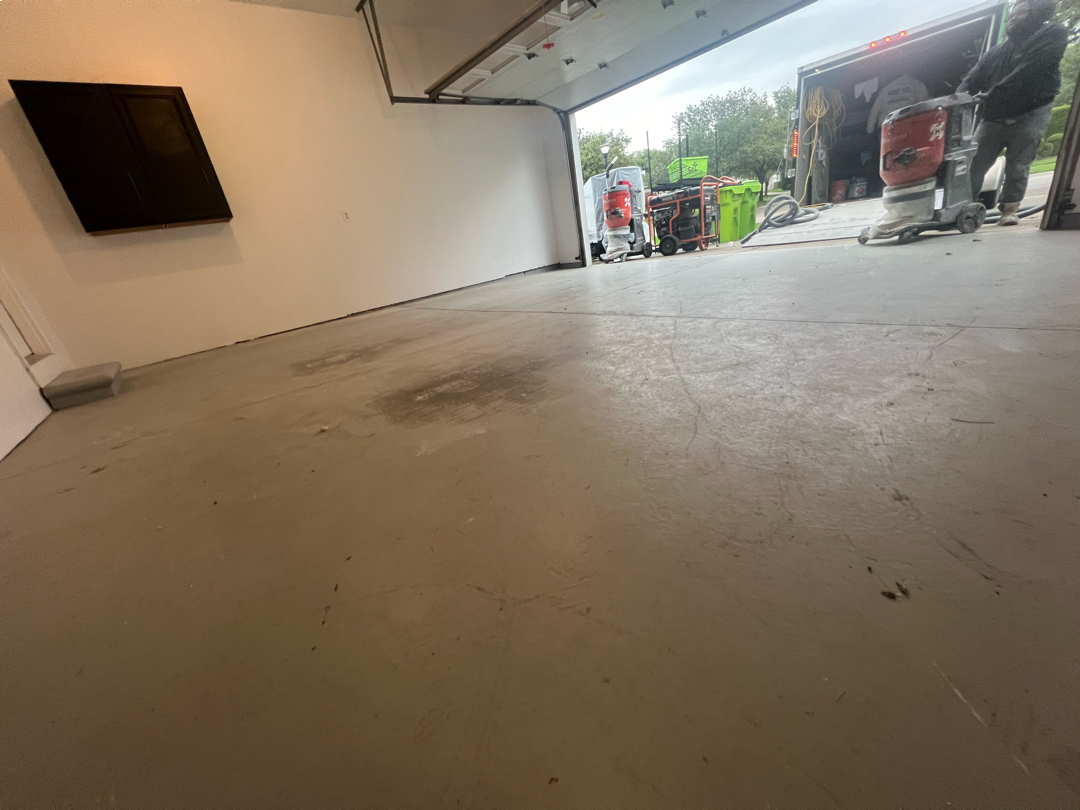 The MotorCity crew began with thorough diamond grinding across the entire garage floor. Even on new concrete in excellent condition, grinding is essential—it removes the smooth troweled surface, opens the pores of the concrete, and creates the mechanical profile necessary for the polyurea/polyaspartic system to achieve a permanent bond. The grinding process also removed the scattered paint spatters and light surface staining, revealing a uniform, clean substrate beneath.