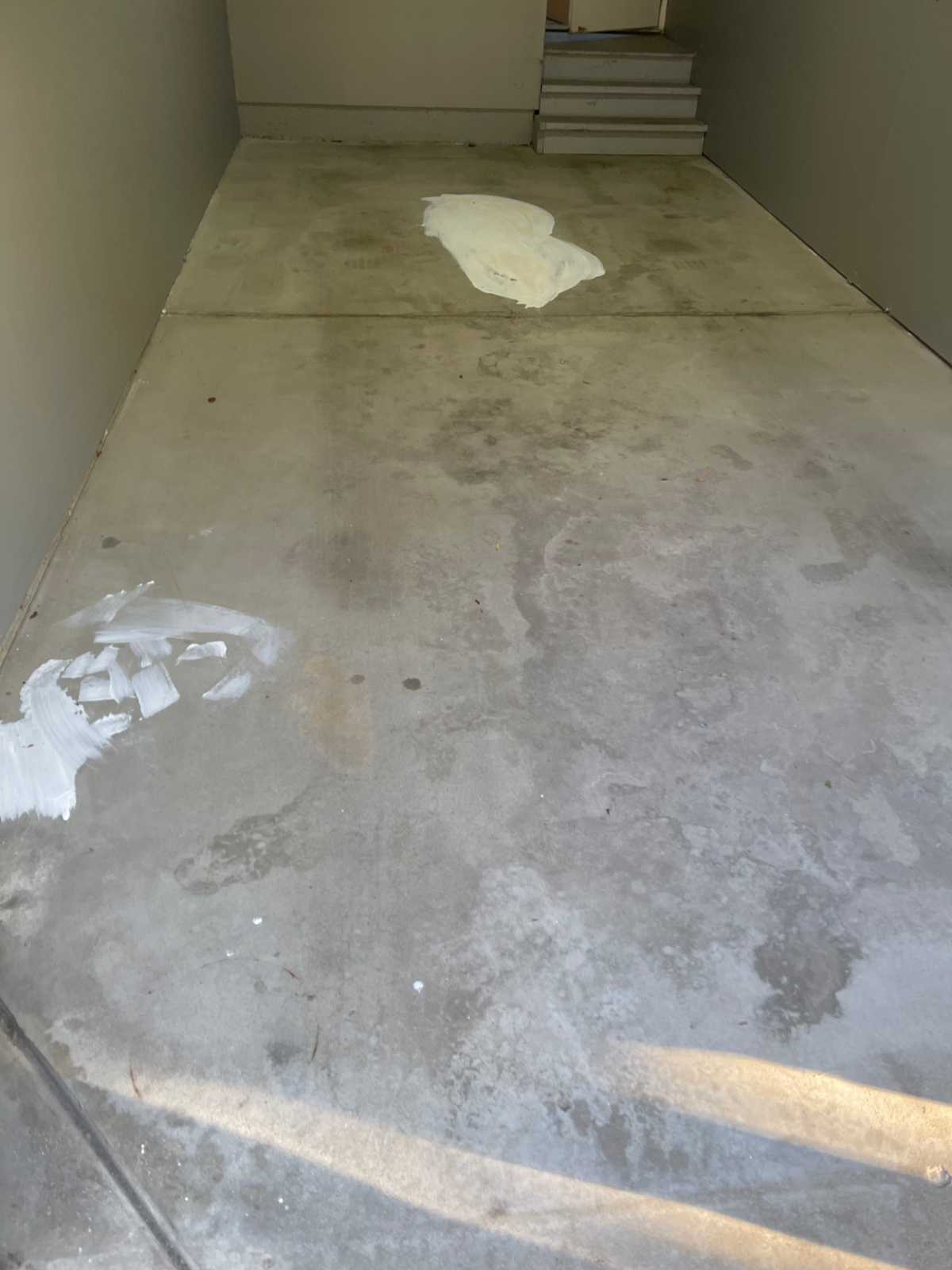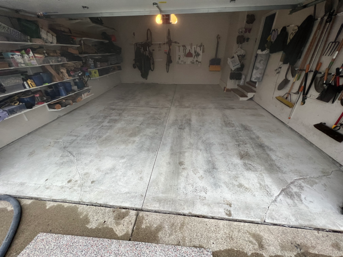 The only notable issue was a stained area on the garage apron near the threshold that required repair, along with a small hairline crack and minor pitting near the garage door entrance. With finished drywall walls painted in a warm gold tone and a neat concrete step at the interior entry door, this garage was already well-maintained.