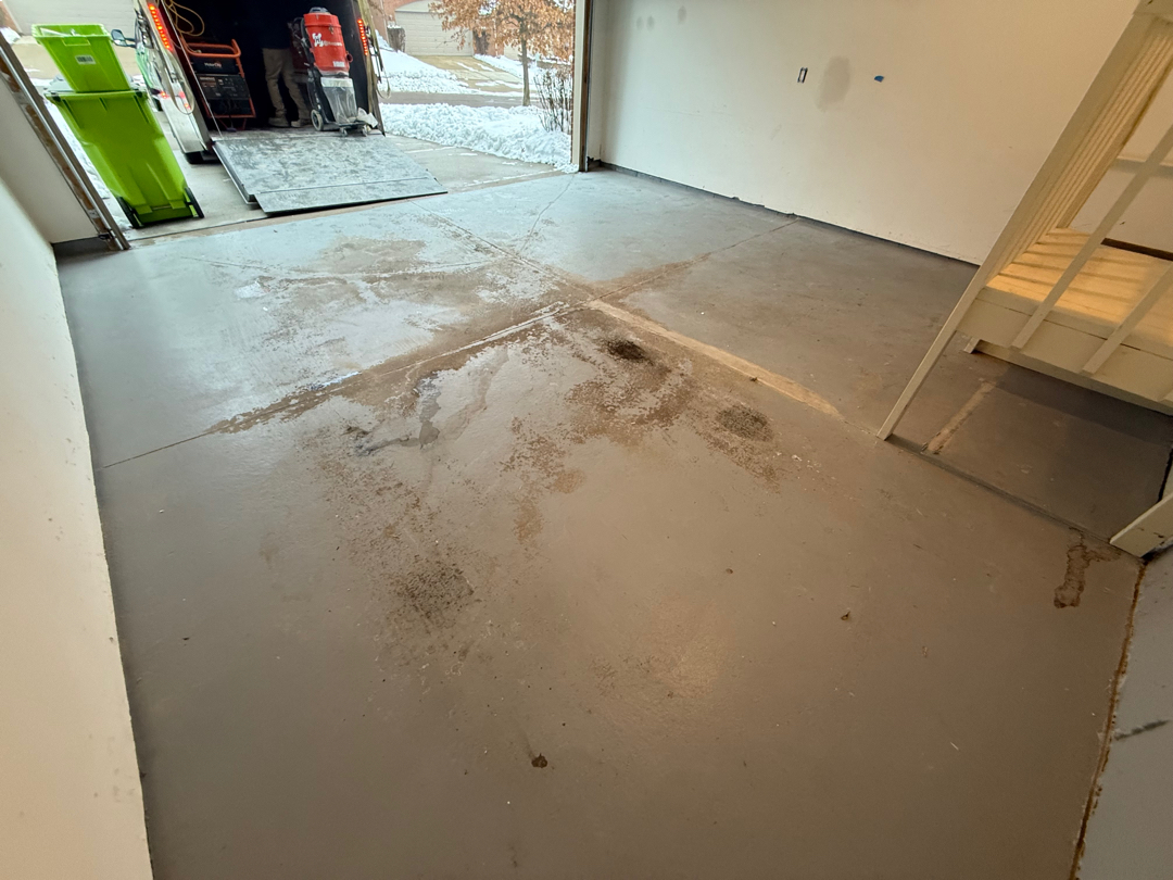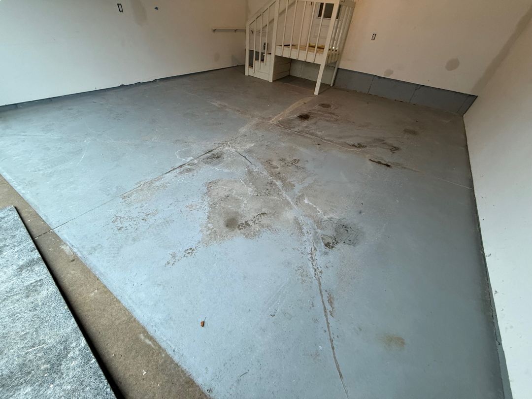 The concrete floor, however, told a different story. Years of Michigan winters had left their mark—rust staining, road salt residue, light pitting scattered throughout, and a few small cracks running through the slab. With a moisture content reading of 4%, the concrete also needed remediation before any coating could be applied.