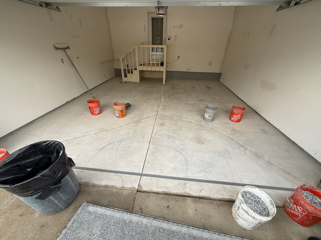 Our crew moved the grinders covered methodically across each section, producing the consistent scratch pattern that ensures maximum coating adhesion. The crew paid careful attention to the areas around the control joints, the garage door threshold, and the concrete step at the interior entry door, ensuring every surface that would receive the coating was properly profiled.