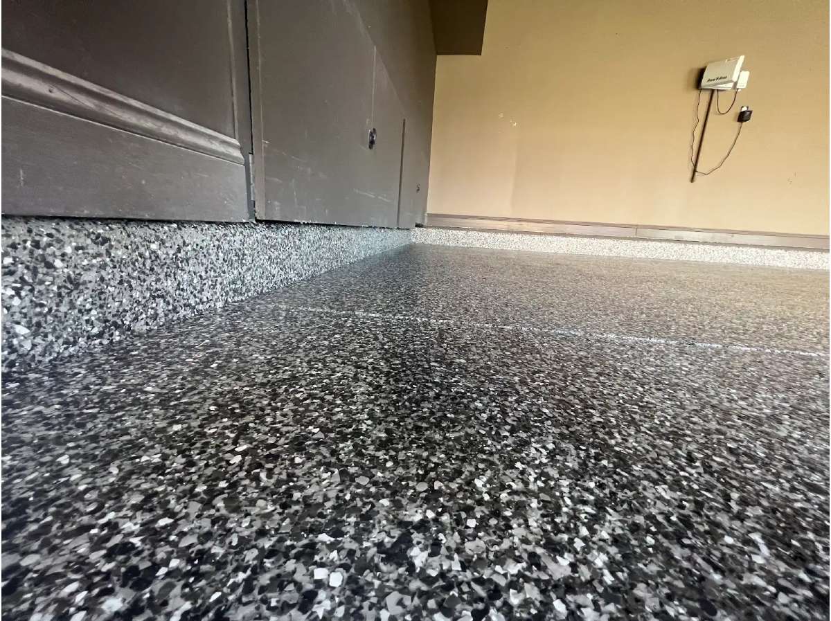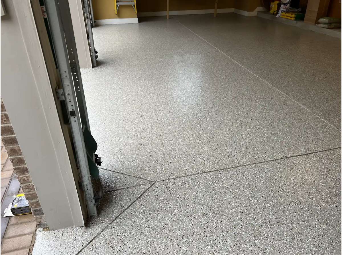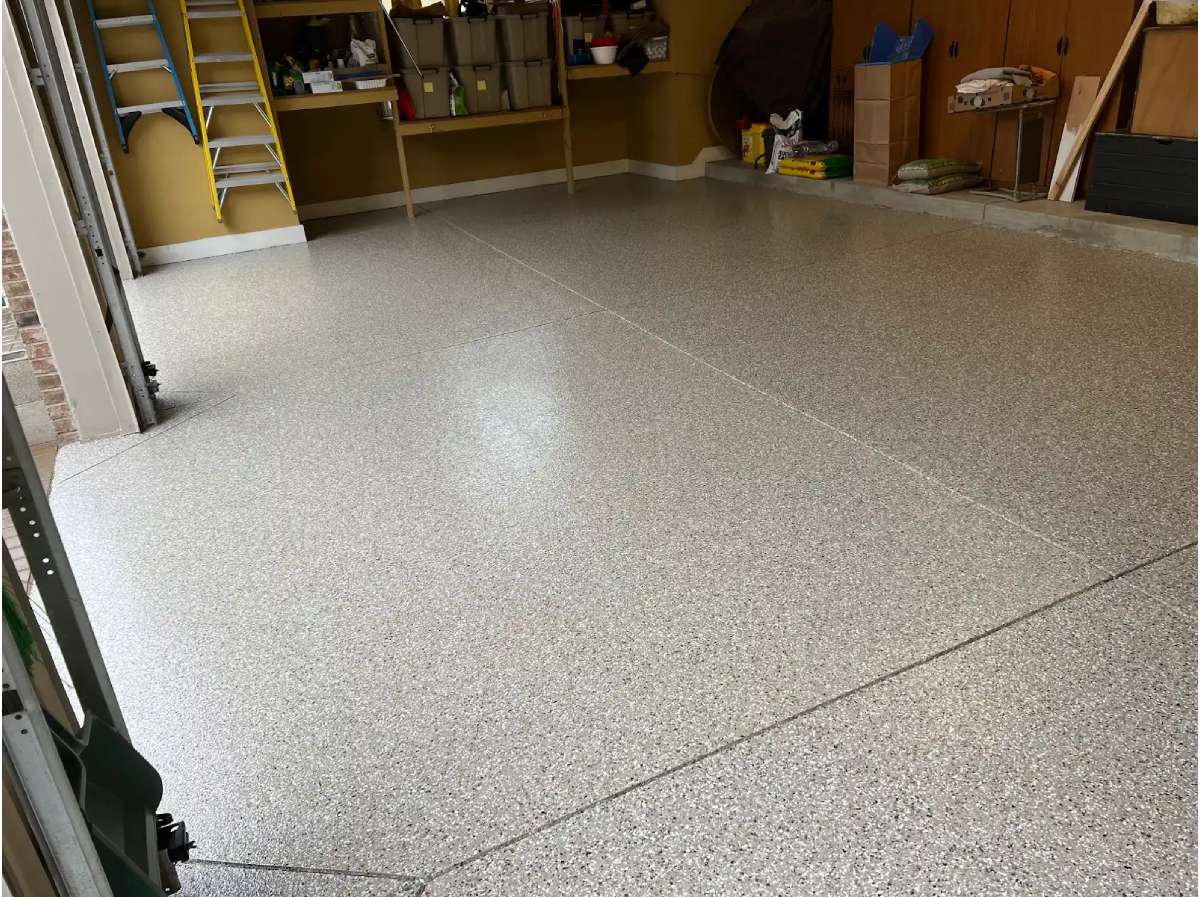 The finished floor represents professional coating installation at its finest. The 757 square feet now showcase a stunning, multi-dimensional finish that is both beautiful and durable. The grey base provides a sophisticated foundation, the decorative flakes add visual interest, and the glossy clear coat delivers a brilliant, easy-to-clean surface. Most importantly, the floor is now protected against the harsh climate of Michigan—road salt, motor oil, hot tire pickup, and other contaminants won’t penetrate this professionally coated surface. The homeowners can maintain their floor’s like-new appearance with simple sweeping and occasional mopping for years to come.