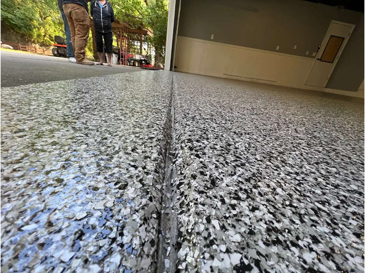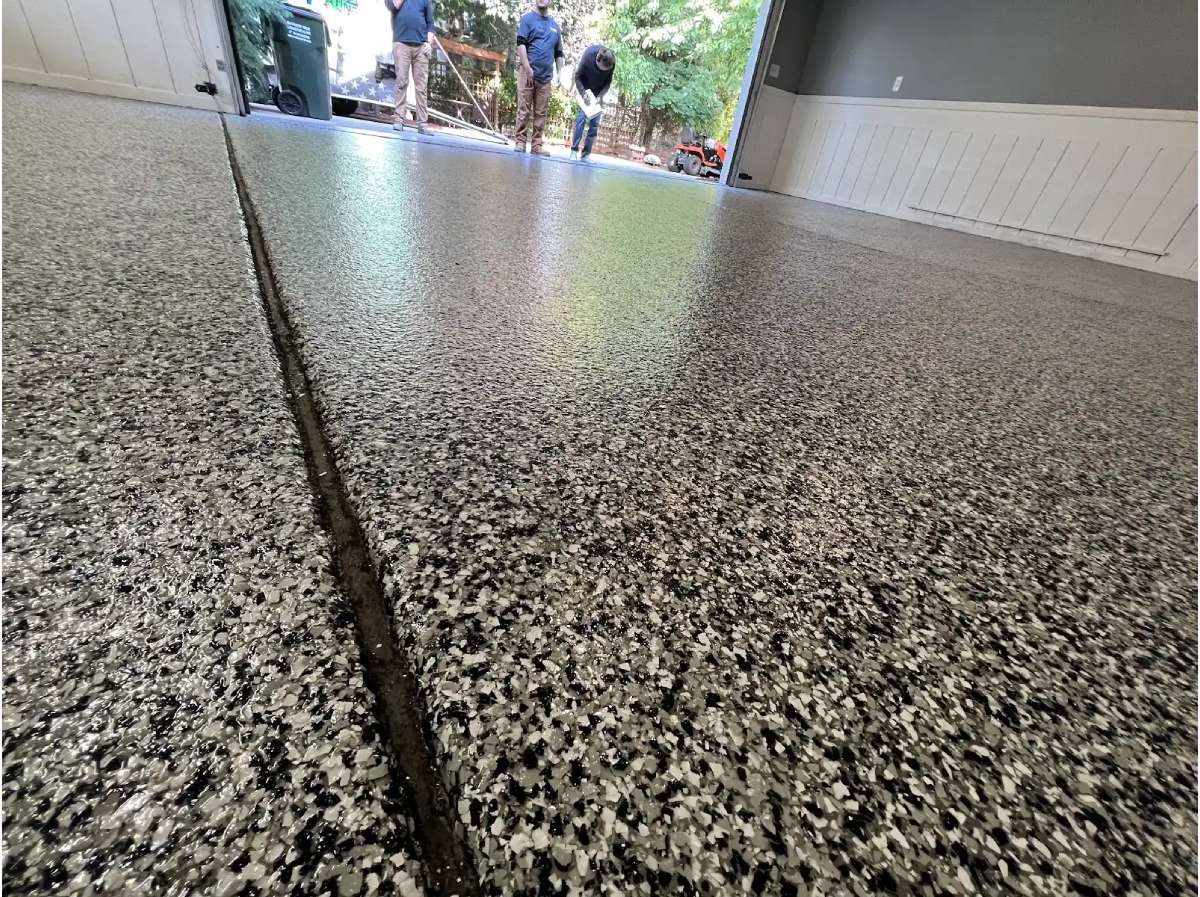 Once repairs cured, our team applied the Silvercreek color system to the 356-square-foot garage. Using 4 liters of grey base paint and 2 liters of activator, they created a sophisticated foundation. The crew broadcast 2 full boxes of decorative flakes across the wet base coat, recovering 1 box worth—indicating substantial, nearly full-coverage flake application. The Silvercreek color palette created a refined, multi-tonal finish that would hide dirt and minor debris while adding visual depth. Shark Grip was incorporated into the clear coat system, addressing the homeowners’ traction concerns without compromising the easy-clean surface.