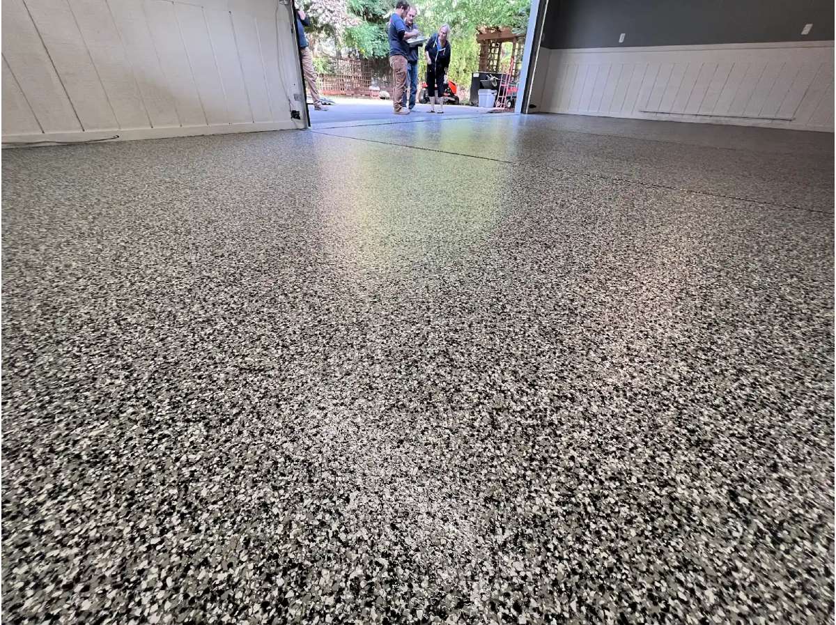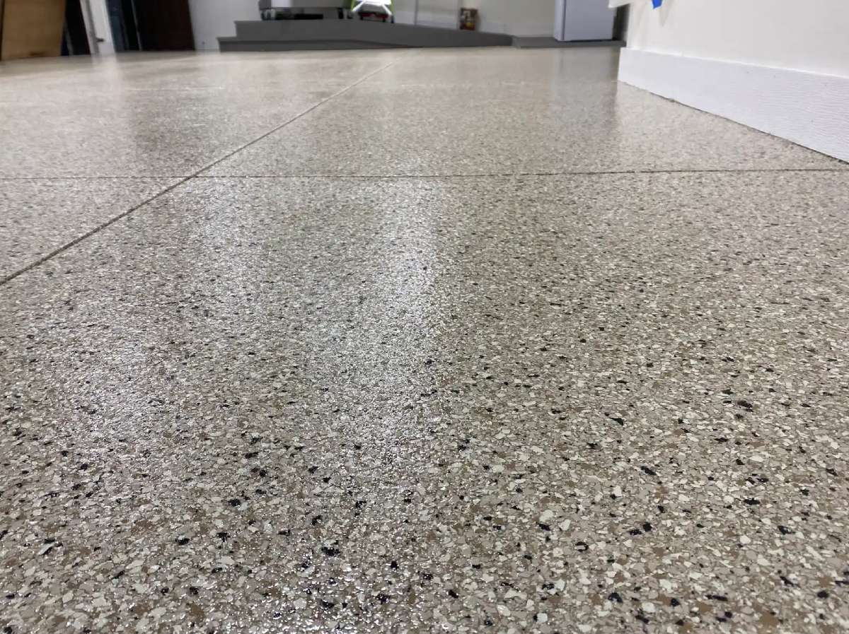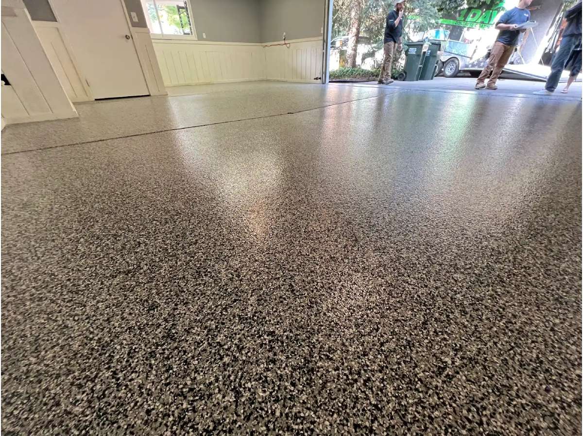 While the base coat remained wet, our team immediately broadcast the decorative flake blend across the entire surface. The multi-tonal flake system—featuring tan and beige tones with black and white accents—created substantial coverage that added visual depth and texture while still allowing hints of the grey base to show through.