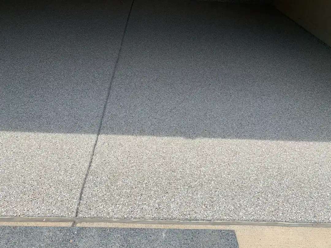 The front porch and walkway received the warm Pecan color system—2 liters of tan base paint with 1 liter of activator. Our crew broadcast 2 buckets of decorative flakes, creating a welcoming entrance that complemented the home’s exterior. The Pecan finish provided a natural, earthy aesthetic while the Shark Grip additive ensured safe footing on steps and sloped walkway sections.