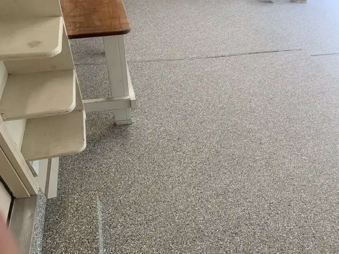 Our crew mixed the tan base coat using 5 liters of base paint and 2.5 liters of hardener, creating the warm foundation characteristic of the Pebble Beach color flake blend. Working methodically across the main floor, up the step, across the vertical surfaces, and over the wood step, they rolled the coating in overlapping passes.