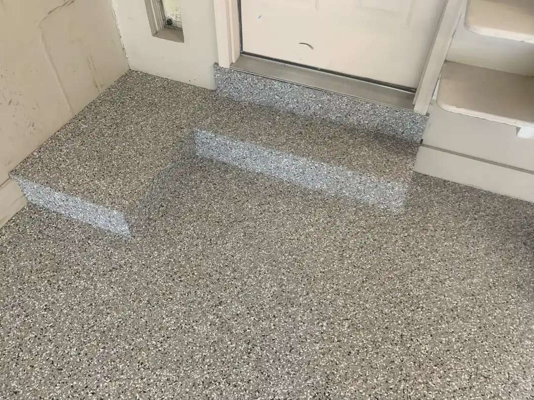 The final phase involved mixing and applying the clear coat system—9 liters each of Part A and Part B—with 36-grit traction additive thoroughly incorporated. This coarser grit provides substantial slip resistance, particularly important on the side step-up area and two concrete steps where safe footing is essential. The clear coat flowed beautifully over the flakes, encapsulating them completely and creating the smooth, sealed surface with brilliant shine.