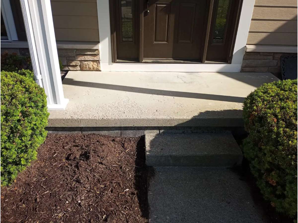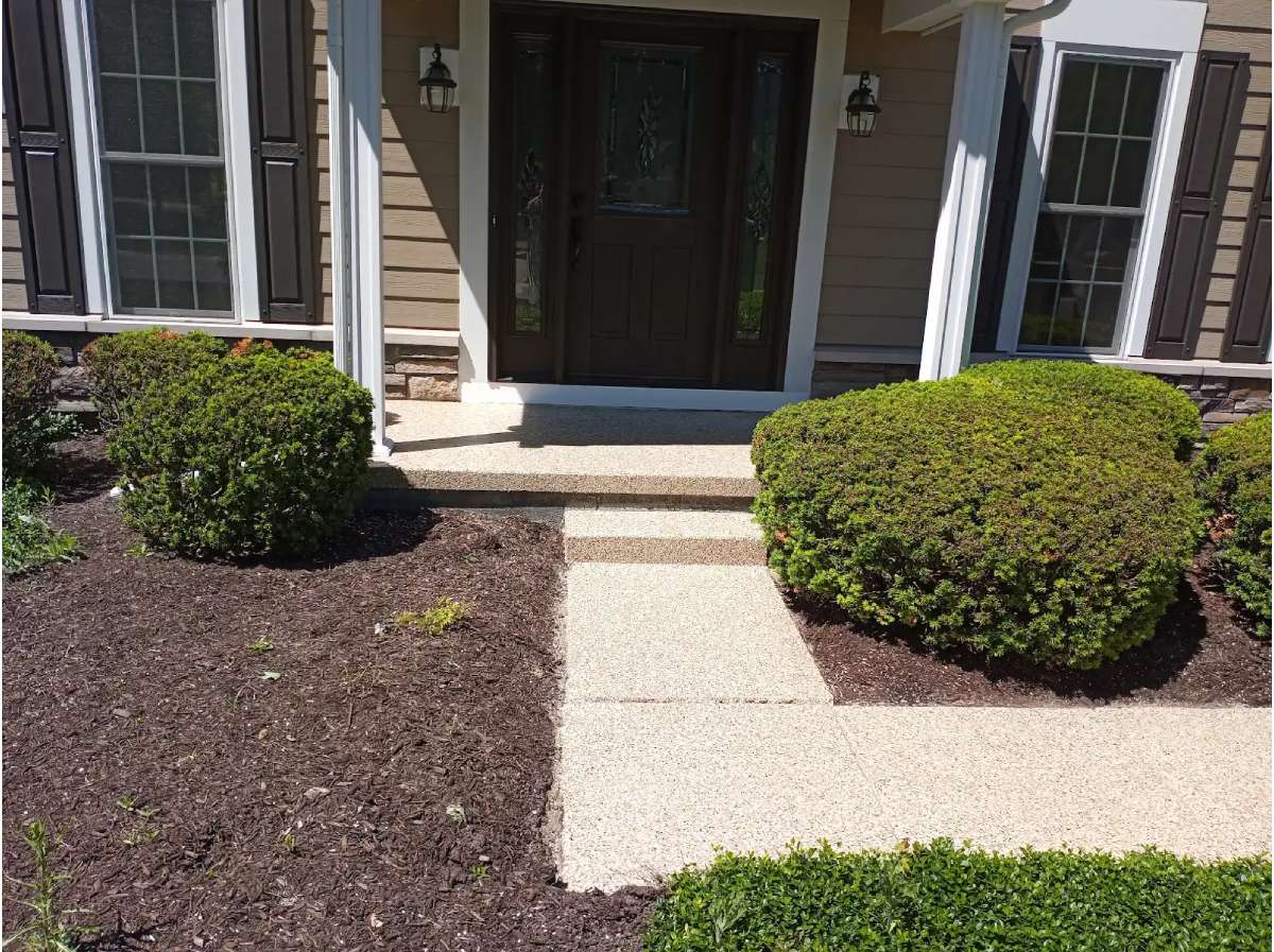 The finished project represents a total property enhancement. The garage floor coating in its sophisticated Silvercreek finish is smooth, glossy, and protected against hot tire pickup, oil, and road salt. The front entrance showcases the inviting Pecan system, with consistent color and texture from walkway to porch to steps. Both surfaces provide the slip resistance the homeowners needed, with easy maintenance requiring only occasional sweeping and mopping. What began as seriously deteriorated concrete is now a cohesive, beautiful, and functional outdoor living space that will serve the family for decades to come.