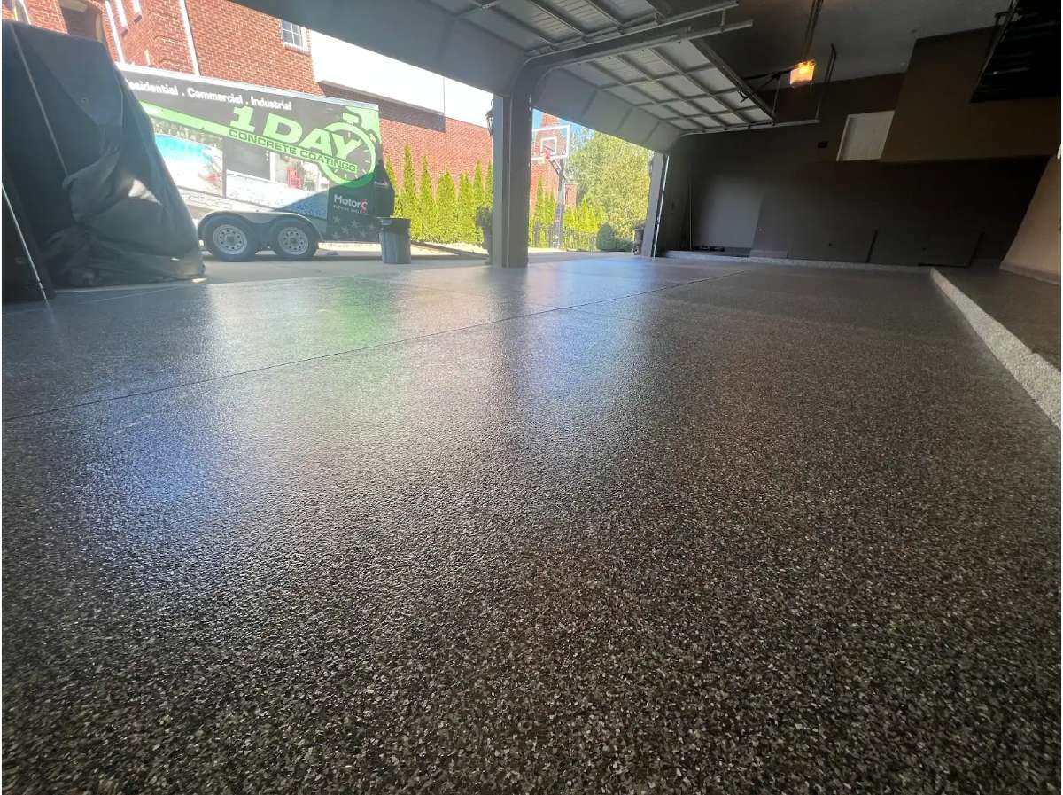 The finished garage floor coating on Donley Ave represents one of MotorCity’s most dramatic transformations. What began as a catastrophically failed floor—front section destroyed, back section deteriorating—is now a stunning, functional automotive workspace. The Slatestone finish flows seamlessly across the entire 504 square feet, with no visible distinction between old and new concrete sections. The lift pads are properly integrated, ready for equipment installation. Most importantly, the floor is now protected by a professional-grade polyurea/polyaspartic system that will handle decades of automotive use, chemical exposure, and the harsh climate of Michigan—a far cry from the disaster that existed before.