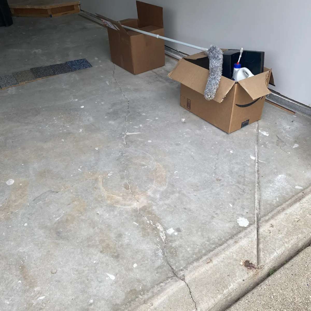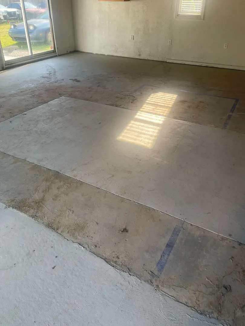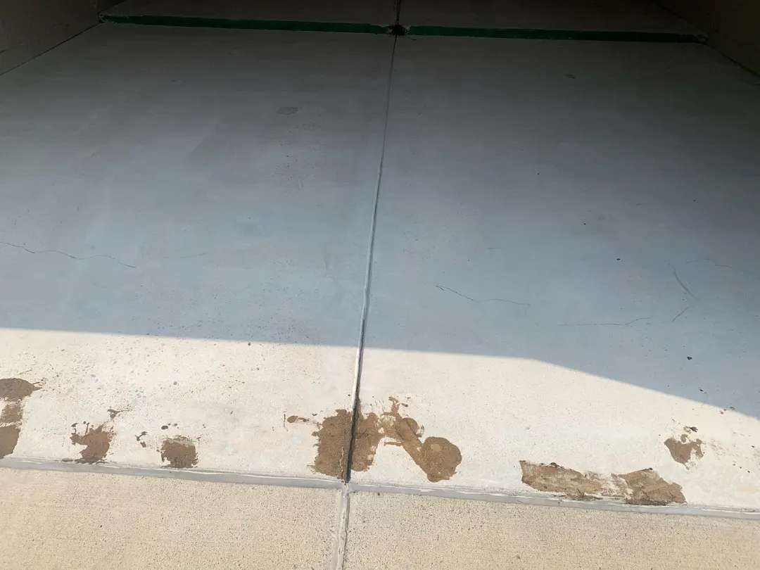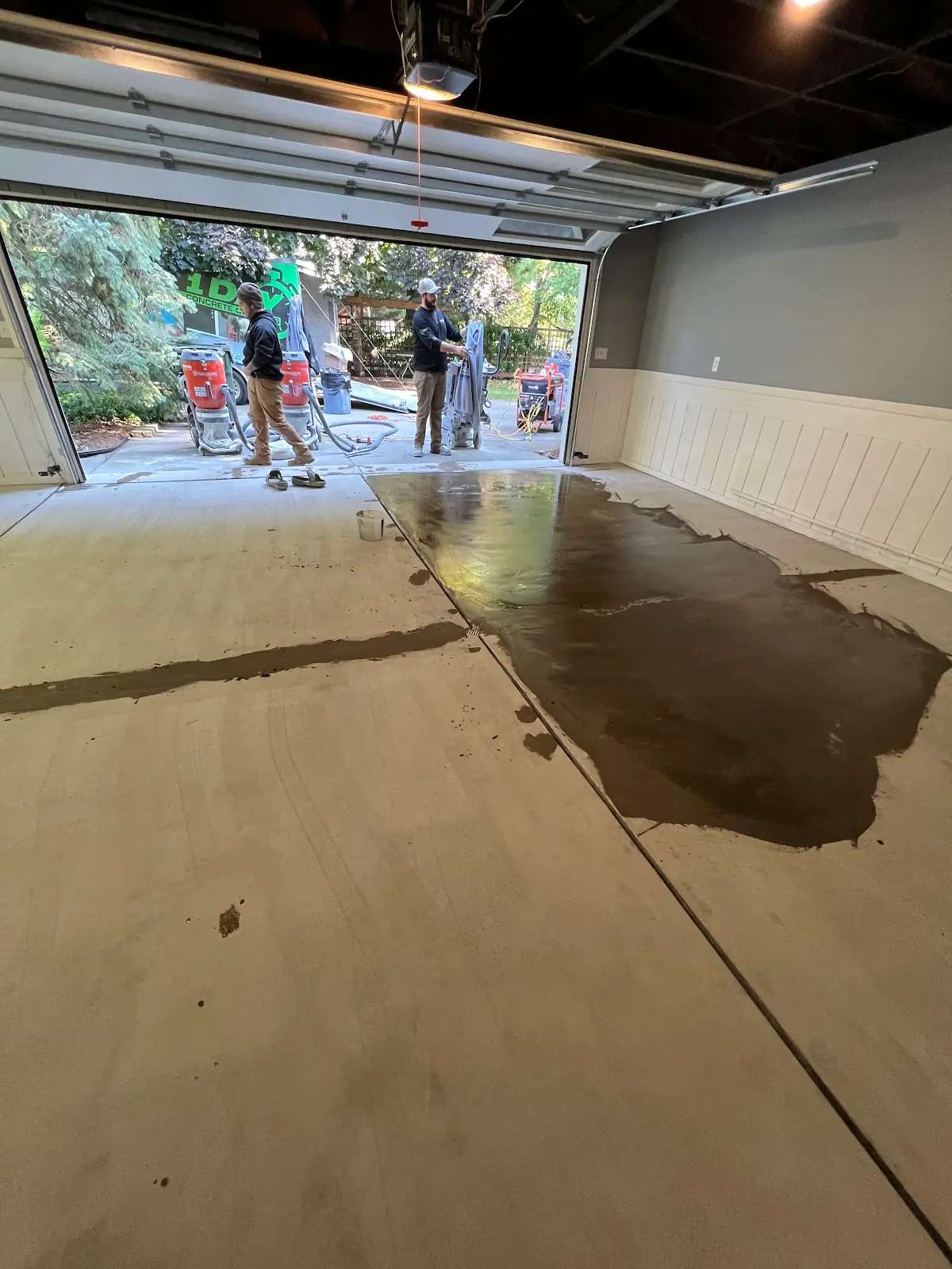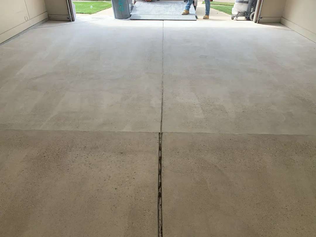 The garage floor received similar attention, with the crew addressing cracks and ensuring both concrete slabs were properly prepared. Given the extent of damage, the garage required a full flood coat application on both slabs—essentially an extra protective layer to ensure long-term performance.