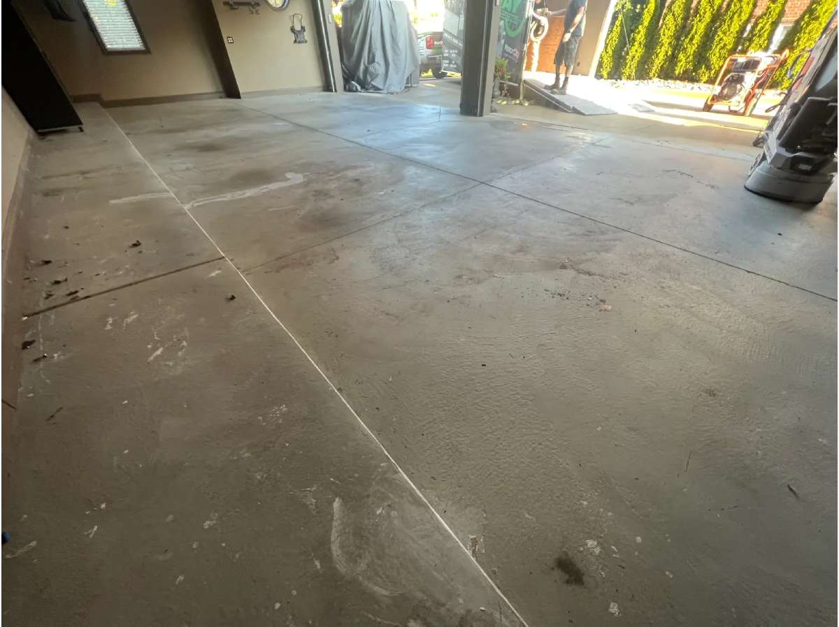 Using professional equipment, our crew systematically stripped away the failing epoxy coating. The removal process revealed the concrete beneath—stained and showing typical garage wear but structurally sound. Once the old coating was completely removed, diamond grinding equipment was deployed across all 528 square feet, the 20-foot step-up area, 10 feet of vertical surface on one side, and the single wood step.