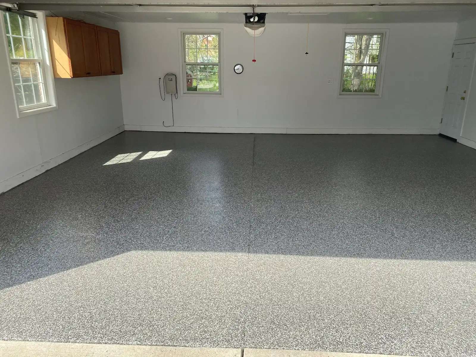 The clear coat fully encapsulates the decorative flake layer. It creates the smooth, continuous surface characteristic of professional installations. The polyaspartic chemistry provides exceptional chemical resistance, UV stability, and abrasion resistance. The fast cure properties of the top coat allowed the homeowners to resume using their garage quickly after installation was completed.