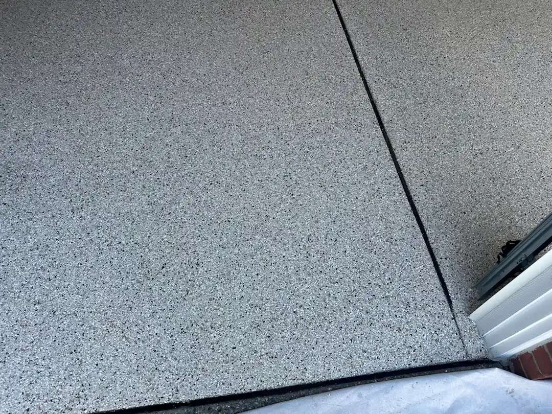 The clear coat fully encapsulates the decorative flake layer, creating the smooth, continuous surface characteristic of professional installations. The polyaspartic chemistry provides strong chemical resistance to automotive fluids, road salts, and household chemicals. The UV stability of the top coat prevents yellowing and color shift, ensuring both color zones maintain their appearance throughout years of sunlight exposure.